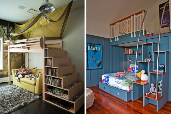 لكن هذا الخيار مثالي لحضانة بها طفلان. مكان واحد للنوم منظم في "العلية" ، والسفلي على المنصة التي تضم صناديق التخزين. كما لعبت الدرج نفسه بشكل مثير للاهتمام. للوهلة الأولى ، هذه مجرد أرفف مفتوحة ، ولكن إذا نظرت عن كثب ، ستجد درجًا كاملًا به درابزين.
