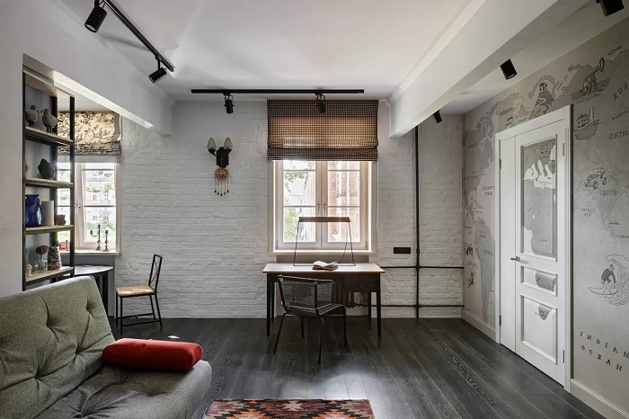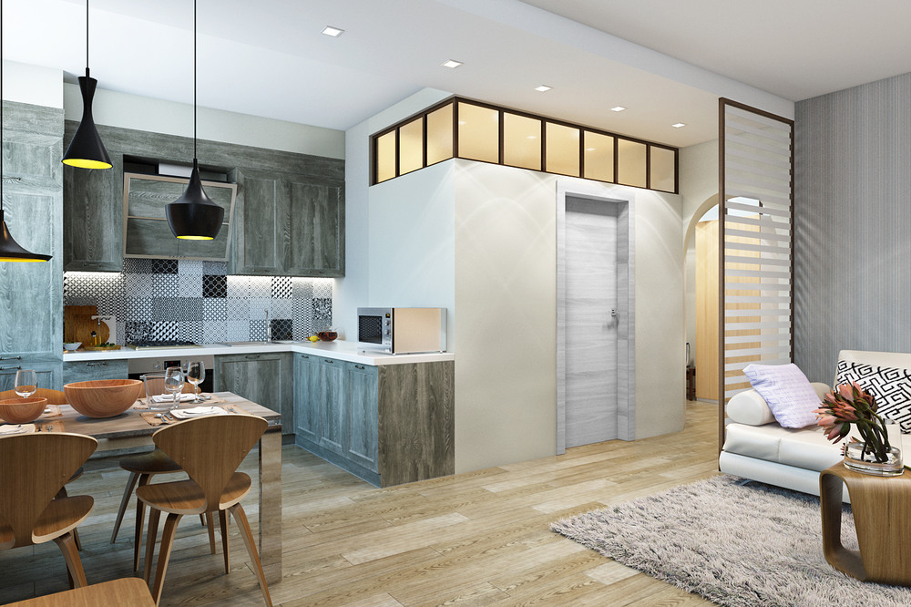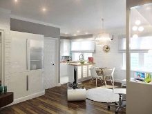 - في شقق تصل إلى 65 مربعًا يمكنك العثور على حل إعادة التطوير دون تحريك الجدران والفواصل ، باستخدام لمسات الألوان ، والأثاث كقواطع ، وخزائن ملابس منزلقة وتقسيم المناطق بالإضاءة ؛