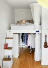 - ضع سريرًا مرتفعًا في زاوية الغرفة بمحاذاة الحائط - الخيار الأكثر ملاءمة وبأسعار معقولة.