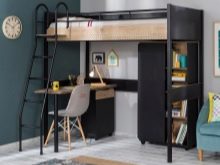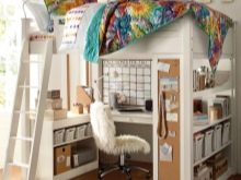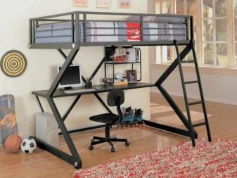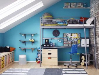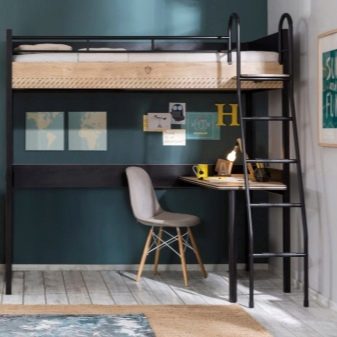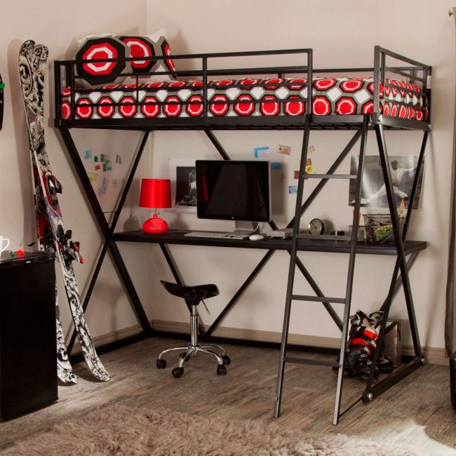 يتناسب السرير العلوي المصنوع من الحديد أو الخشب مع تصميم واضح ومقتضب في غرفة على طراز الدور العلوي. يتم تشجيع وجود الإضاءة في الطبقتين العلوية والسفلية. منطقة العمل - طاولة الكمبيوتر وملحقاتها مصنوعة من البلاستيك الأسود اللامع - سوف تتناسب بشكل متناغم مع البيئة.