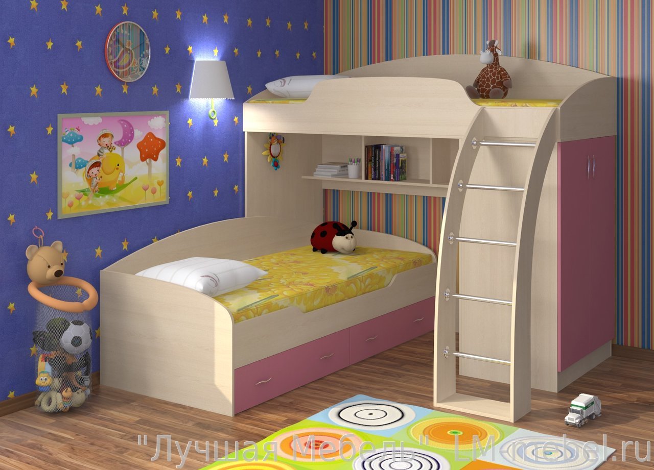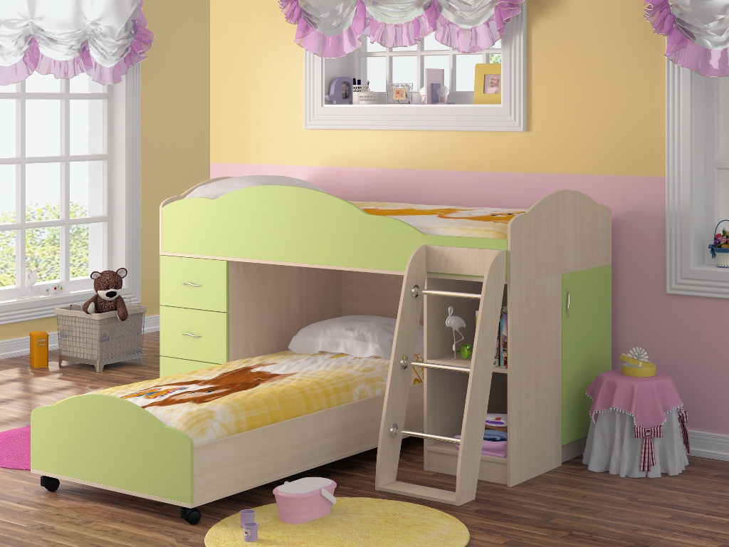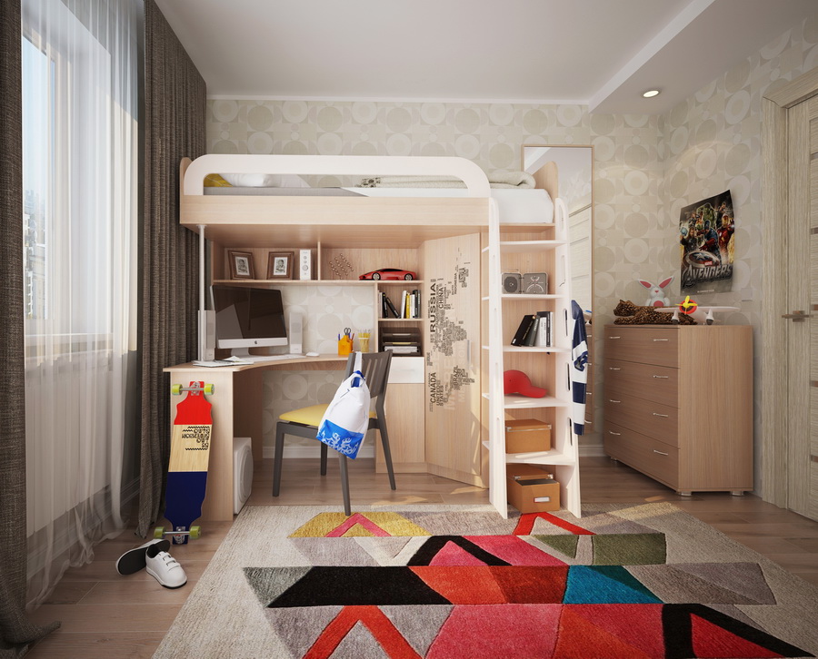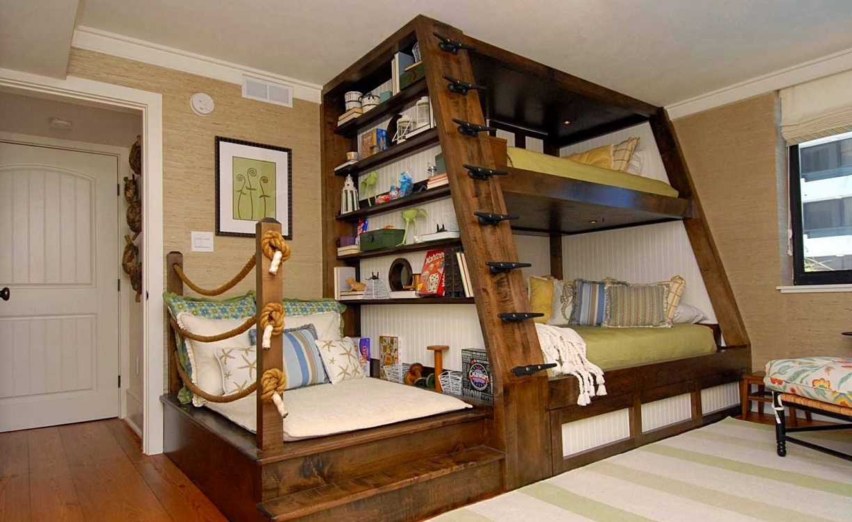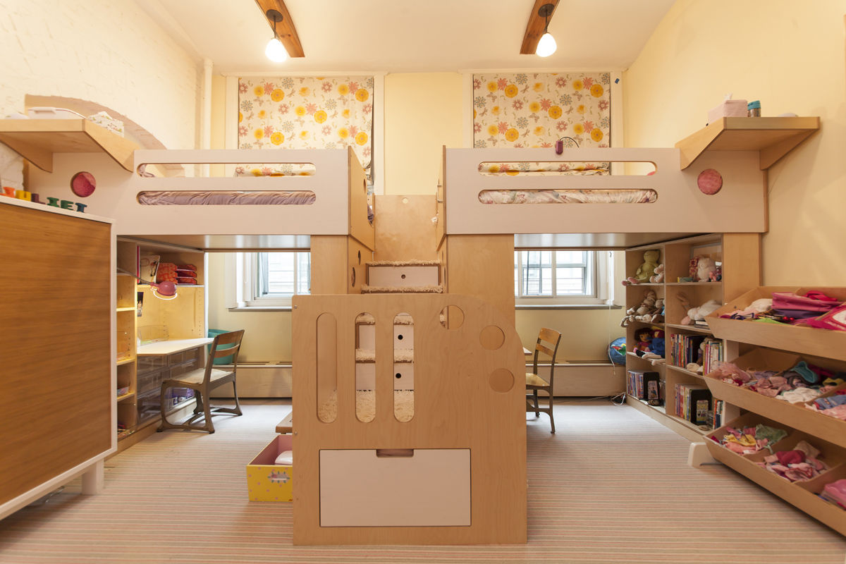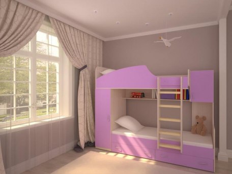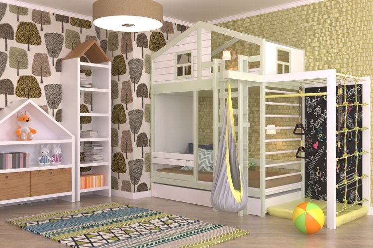 سوف يتم تزيين غرفة الأطفال بسرير لطفلين مع وحدات مشرقة.