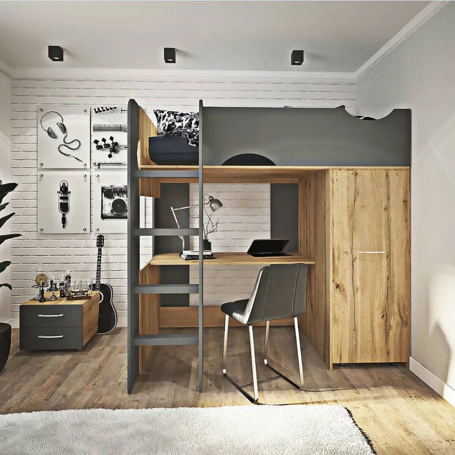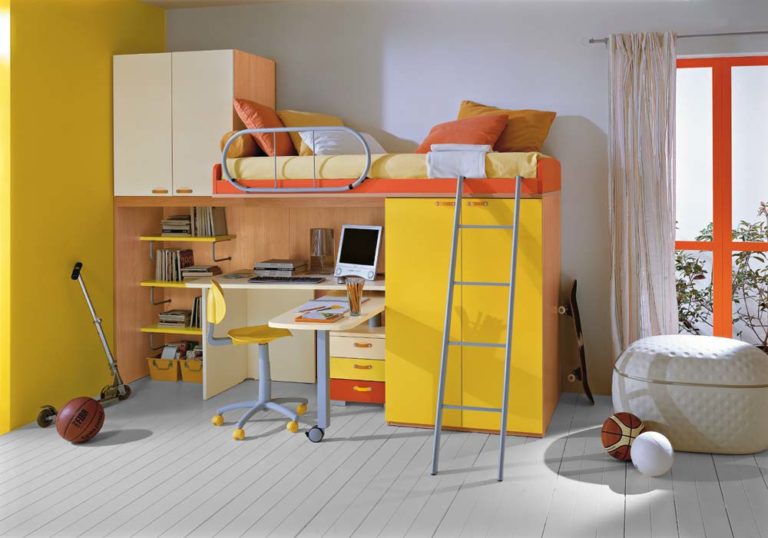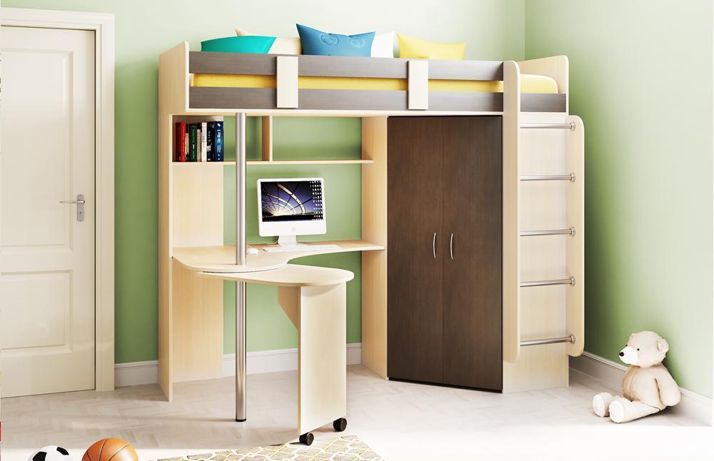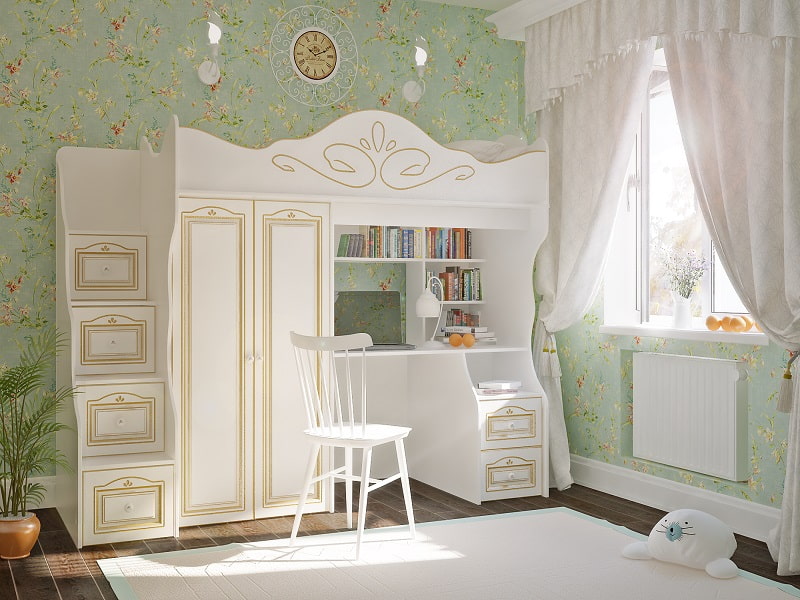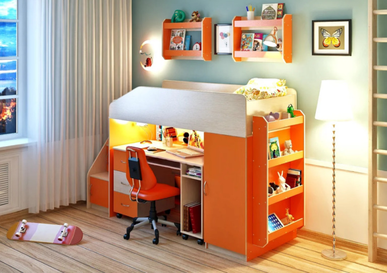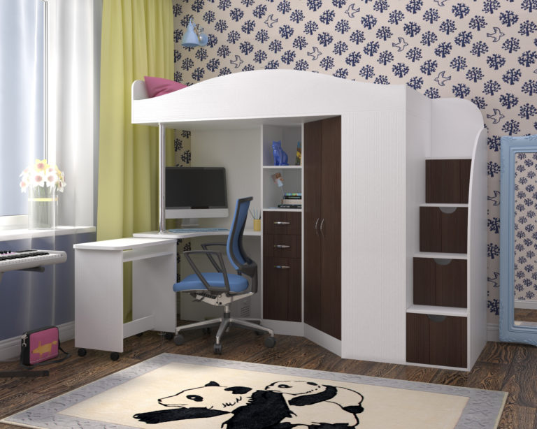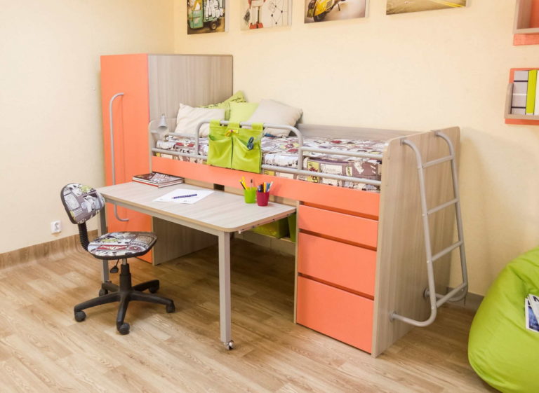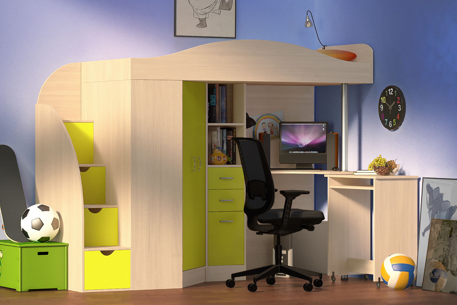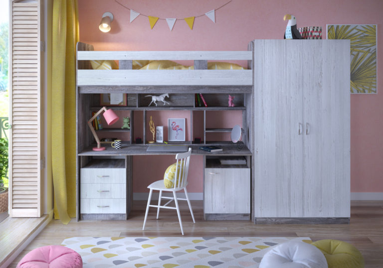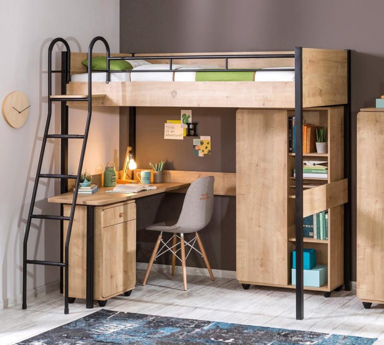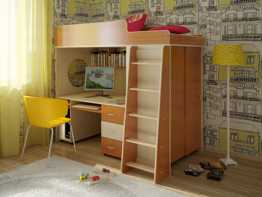 يوجد سرير علية بمساحة للعمل على الكمبيوتر أو مكتب للكتابة بالقرب من النافذة. يُنصح بترتيب الأثاث بحيث يسقط ضوء النهار على المنضدة من الجانب الأيسر (للأشخاص الذين يستخدمون اليد اليمنى والعكس صحيح). إذا لم يكن ذلك ممكنًا ، فتأكد من أن المنطقة السفلية في مكان مضاء جيدًا بواسطة المصباح.