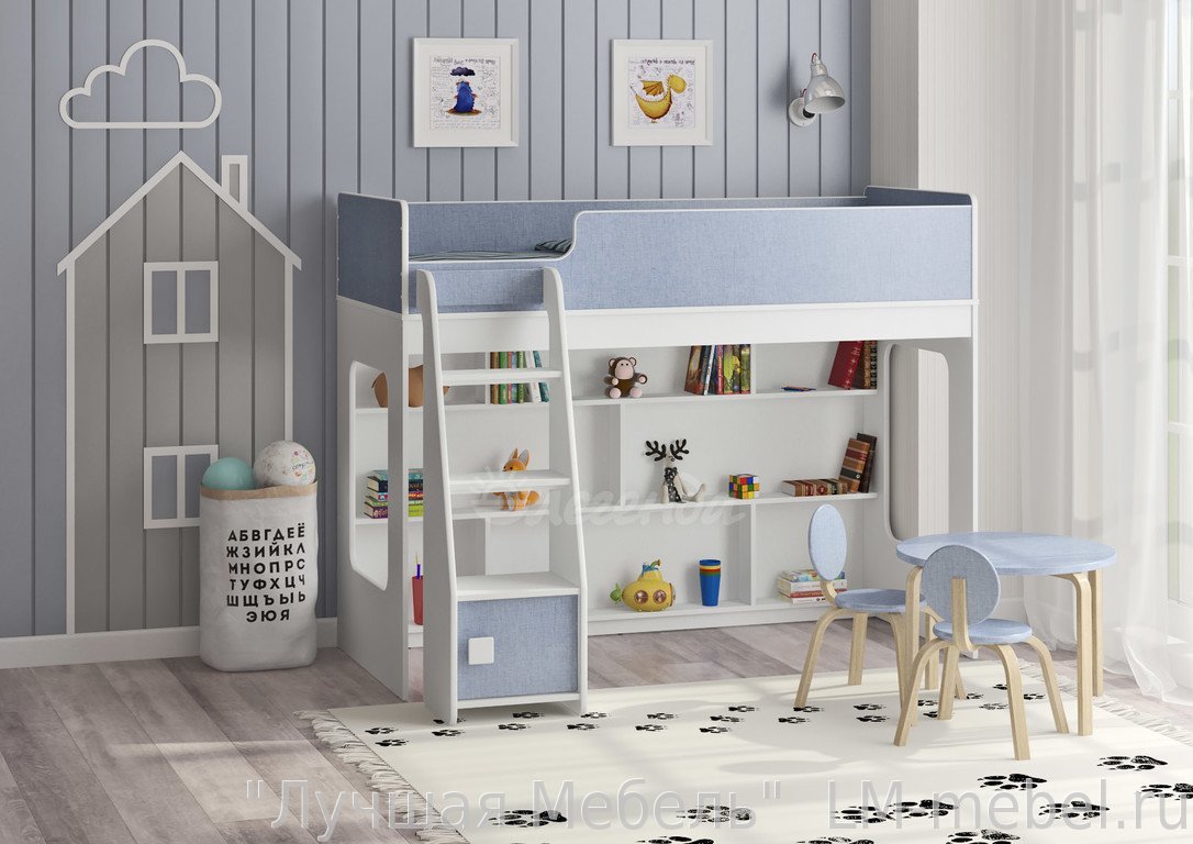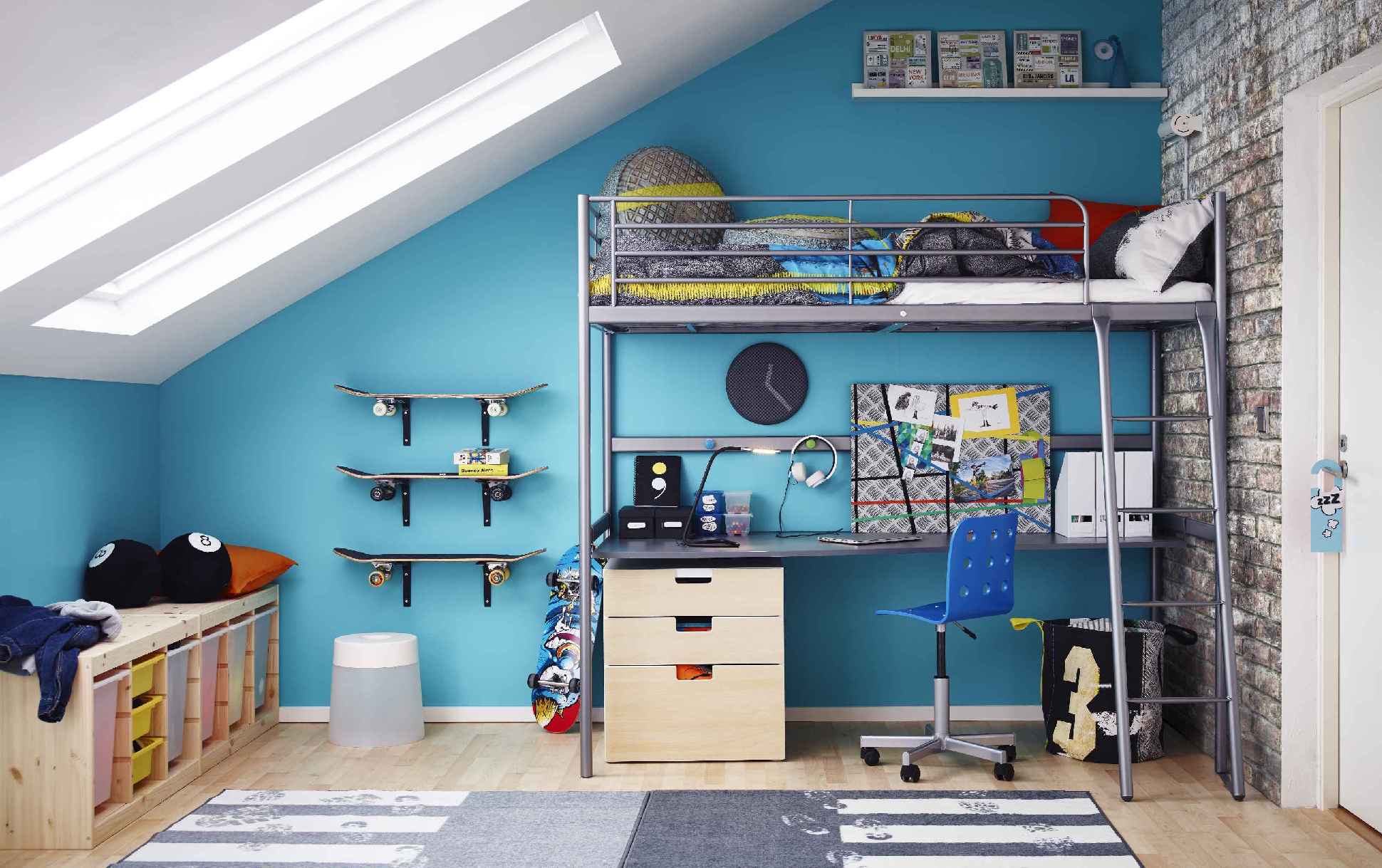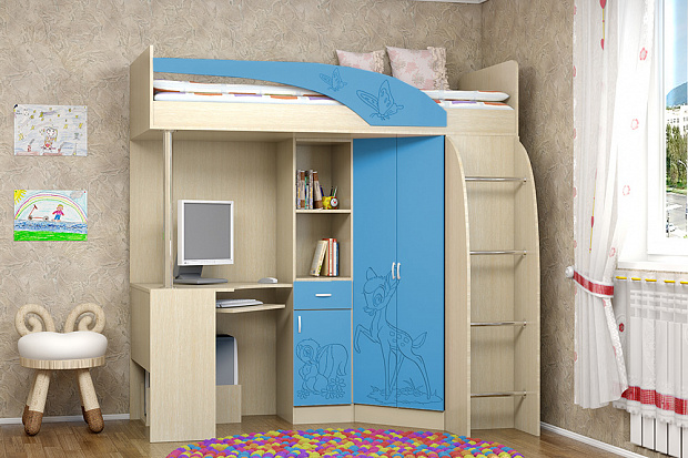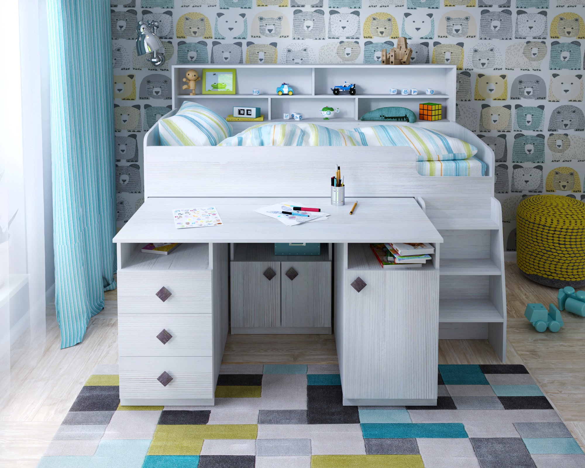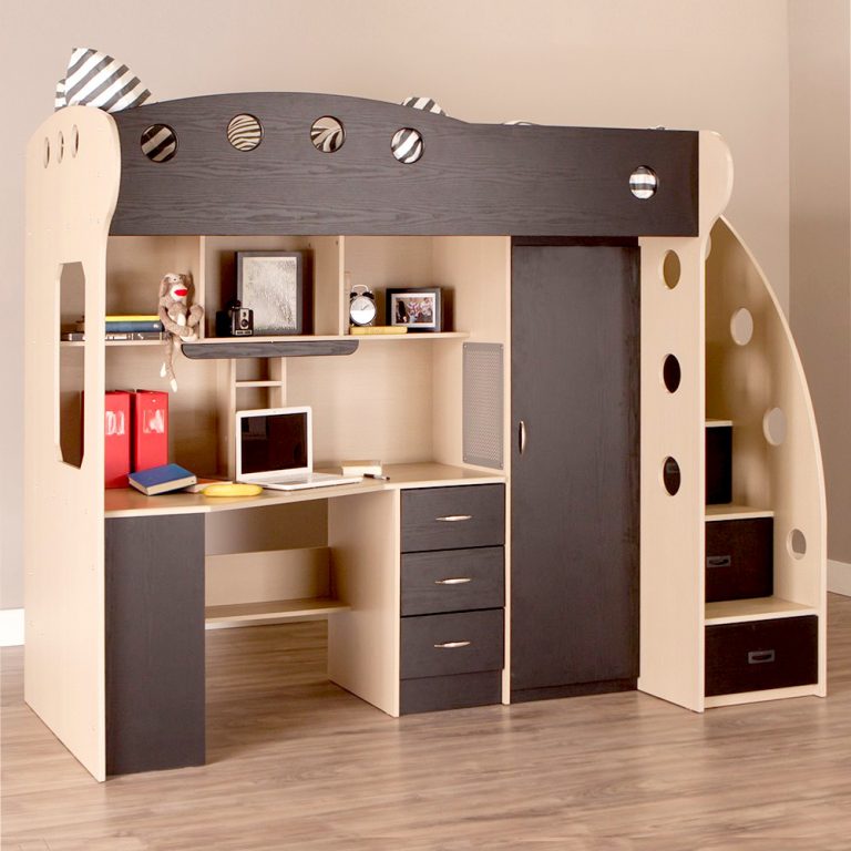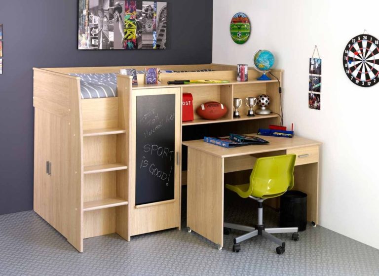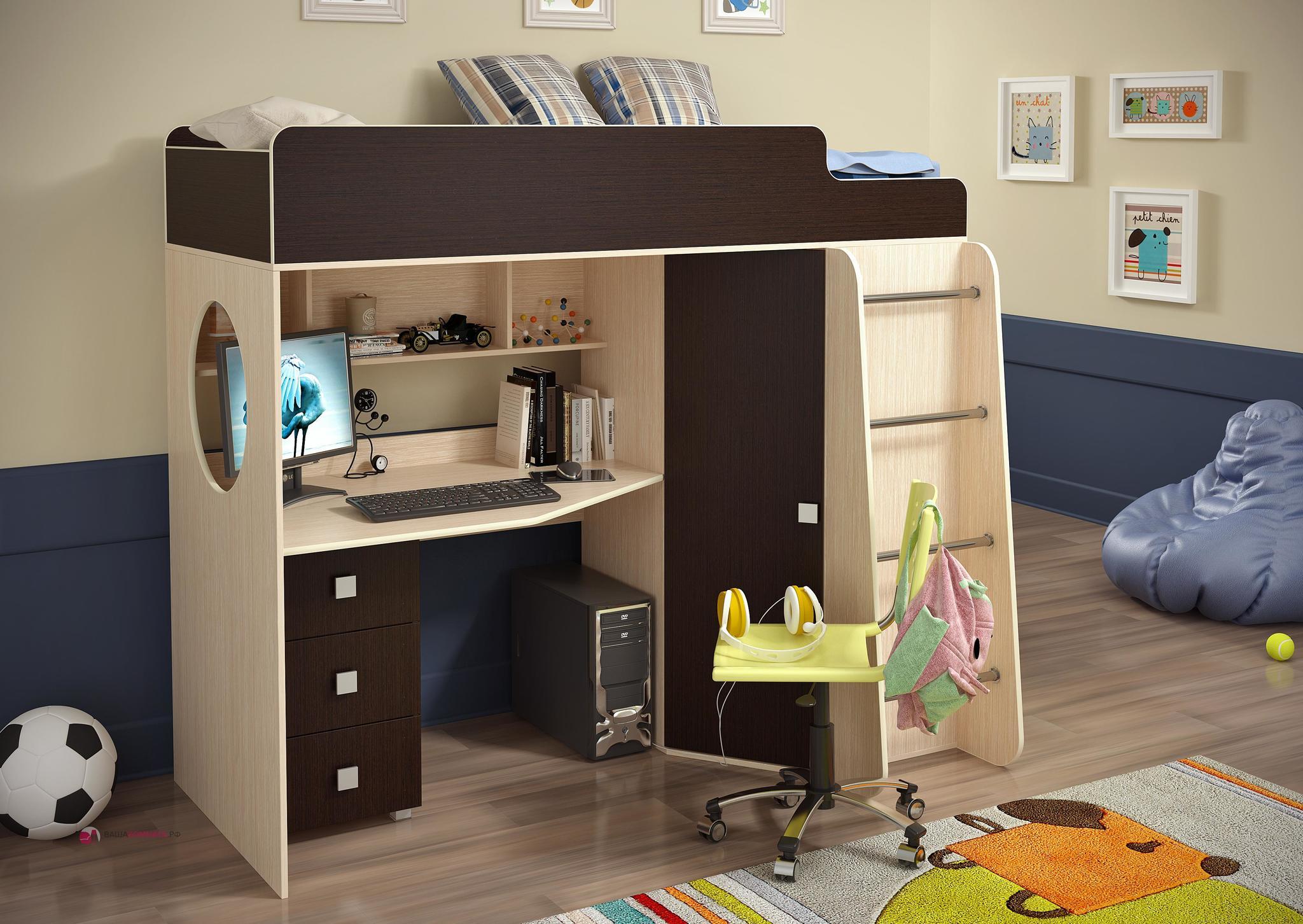يوجد سرير علية بمساحة للعمل على الكمبيوتر أو مكتب للكتابة بالقرب من النافذة. يُنصح بترتيب الأثاث بحيث يسقط ضوء النهار على المنضدة من الجانب الأيسر (للأشخاص الذين يستخدمون اليد اليمنى والعكس صحيح). إذا لم يكن ذلك ممكنًا ، فتأكد من أن المنطقة السفلية في مكان مضاء جيدًا بواسطة المصباح.