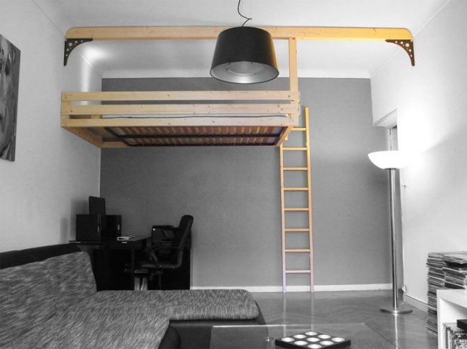 السرير معلق بمثبتات في عدة أماكن على الحائط والسقف ، مما يسمح لك بالحصول على ساقي دعم فقط في الأسفل. الخيار المحتمل هو تثبيت السرير بالسقف وتشكيل جدارين بزاوية.