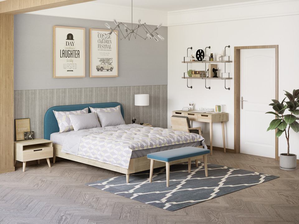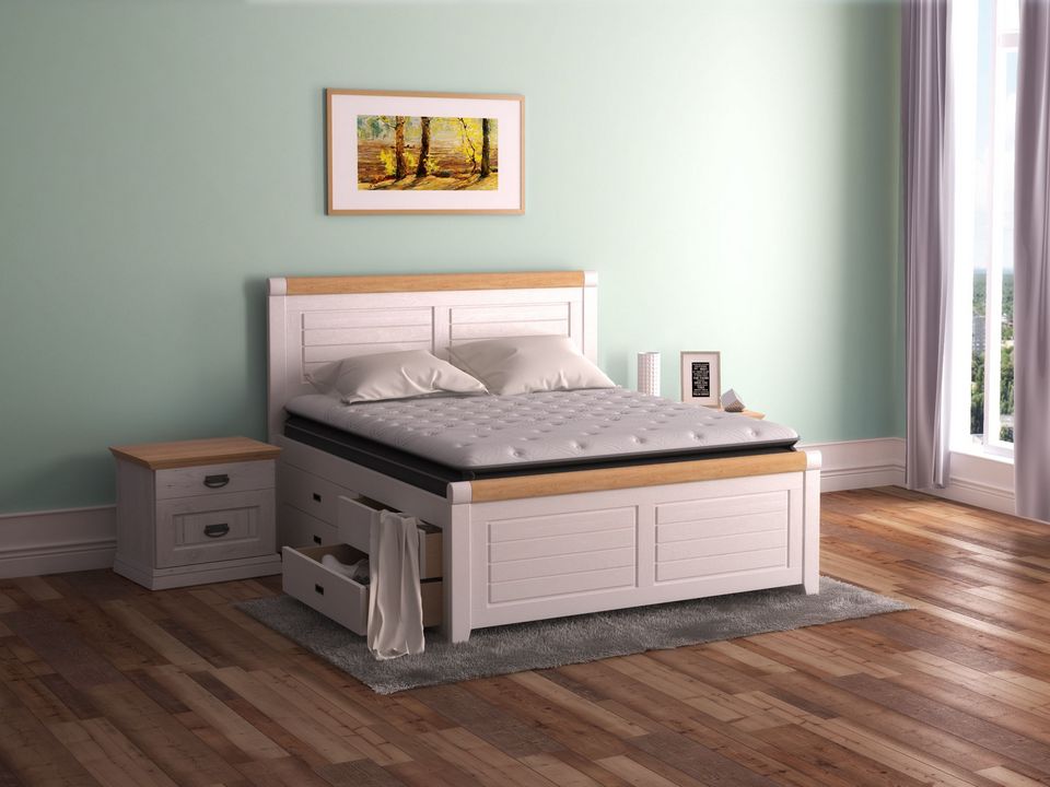 زوايا مسند القدم مستديرة ، والأدراج العريضة واللوح الأمامي العملي يخلقان صورة سرير عصري وأنيق.