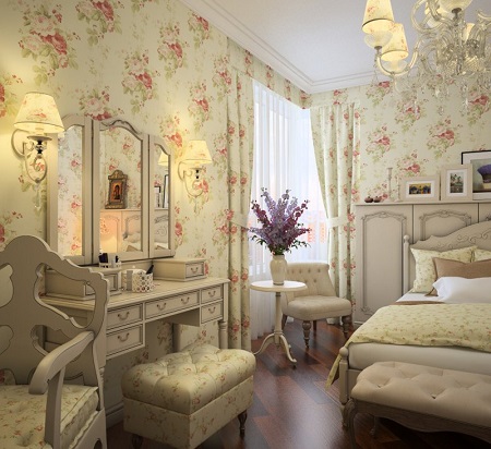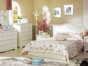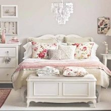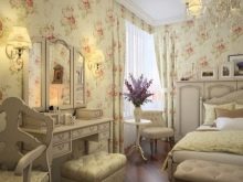 - في مثل هذا التصميم الداخلي ، يمكن الجمع بين المواد المختلفة في شكل الخشب والمعدن والمنسوجات بشكل متناغم.... بالنسبة للمنسوجات ، فإن المنتجات ذات التطريز والدانتيل مناسبة لهذا النمط ، والموديلات ذات الكشكشة مرحب بها.