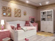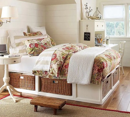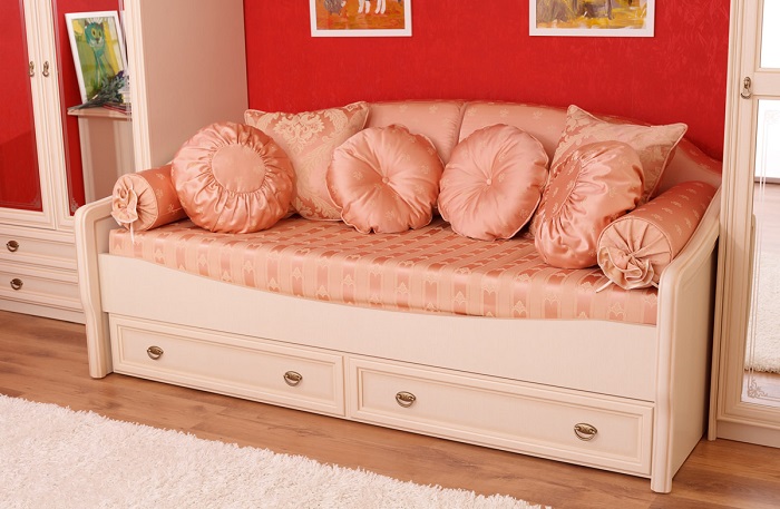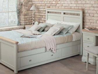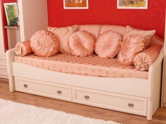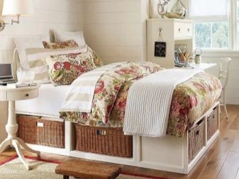 وهناك أيضًا أنواع أخرى من هذه المنتجات. بعض الطرز مجهزة بأدراج. إنها أقسام فسيحة تستخدم لتخزين الفراش والمنسوجات والأشياء الموجودة فيها. تقع هذه الأقسام تحت قاعدة السرير. يمكن سحبها أو فتحها باستخدام آلية ترفع الرصيف. في كثير من الأحيان ، يتم وضع طاولات بجانب السرير بجانب مثل هذا الهيكل ، وخزانة للهدايا التذكارية ، وباقات جميلة من الزهور ، وسلال من الخيزران ، ومناديل مخرمة معلقة.