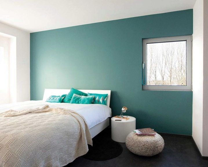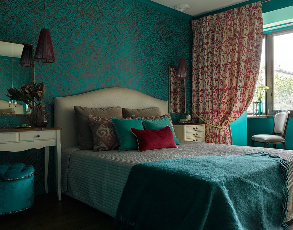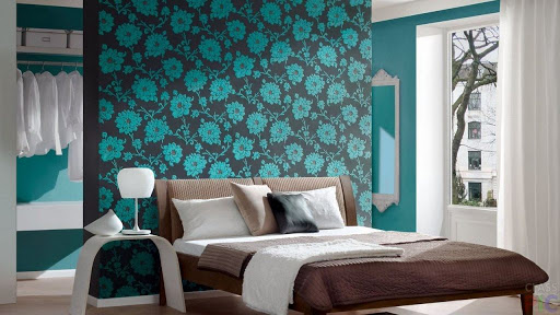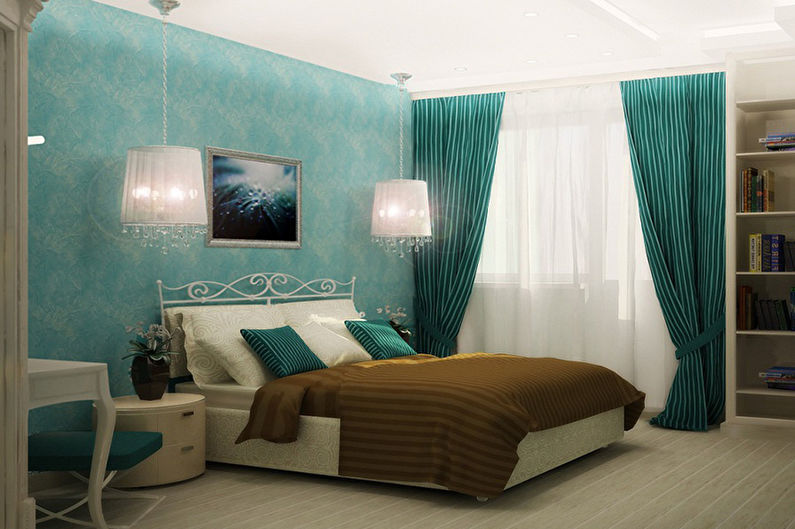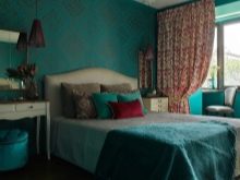 - الفيروز الداكن. إنها مناسبة تمامًا للجدار المميز على رأس السرير ، للغرف ذات النوافذ الكبيرة والأرضيات الفاتحة والقوالب البيضاء.