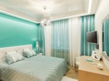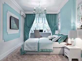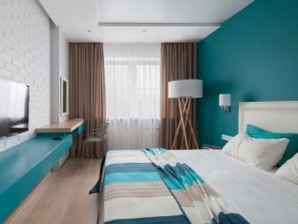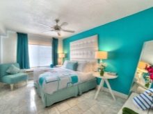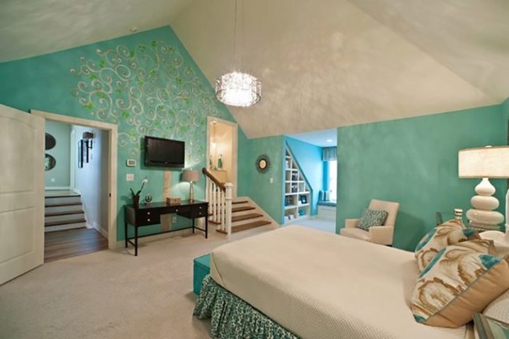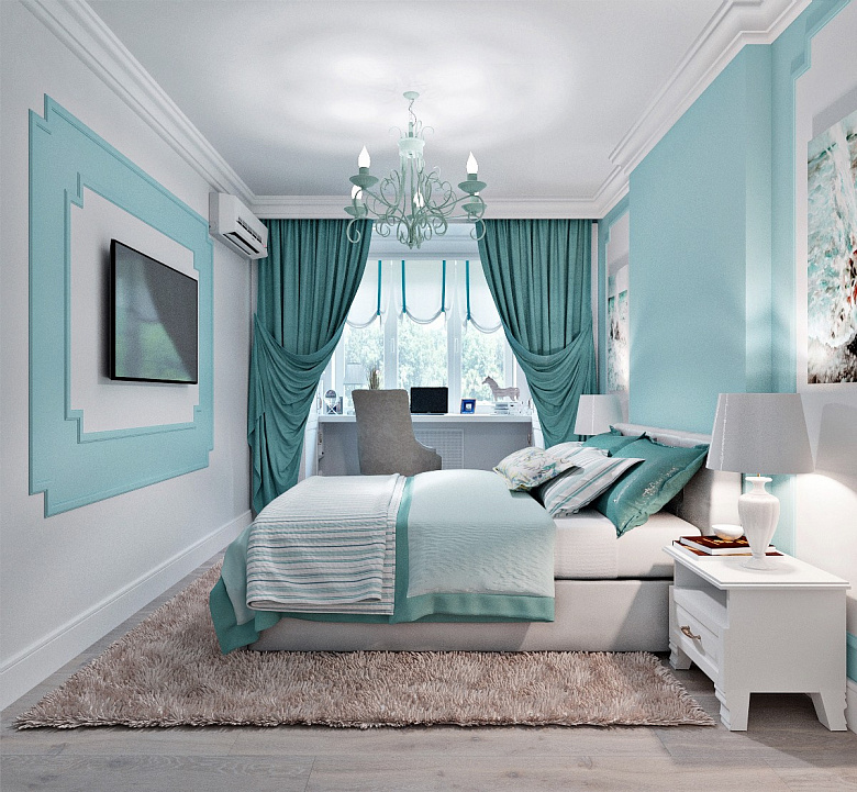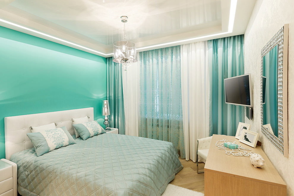 - خلفية الفيروز هي ما تحتاجه غرفة نوم ، جنبًا إلى جنب مع مناطق أخرى من المنزل. تخلق لهجة اللون على الجدران إحساسًا بالخصوصية ، وتقسيم المساحة ، وإضافة المساحة و "الهواء" إليها.