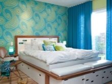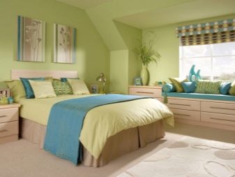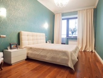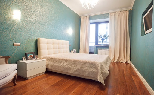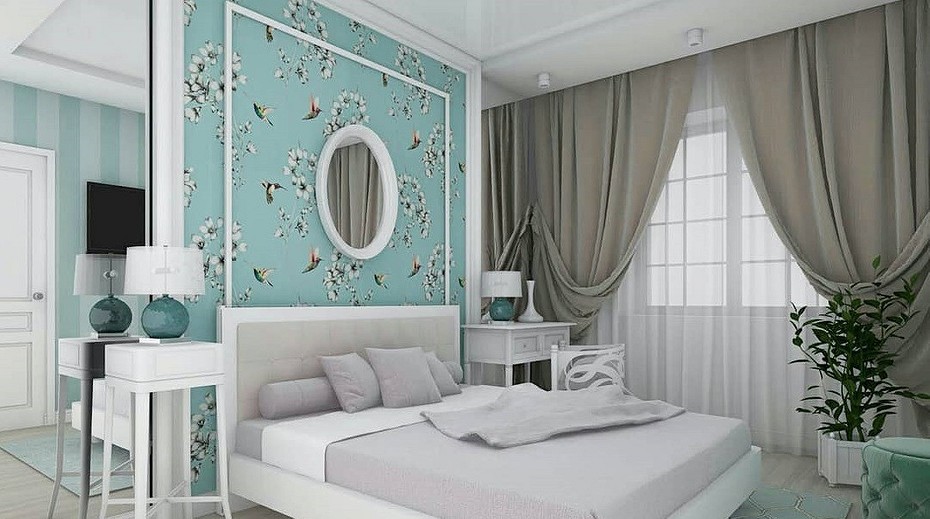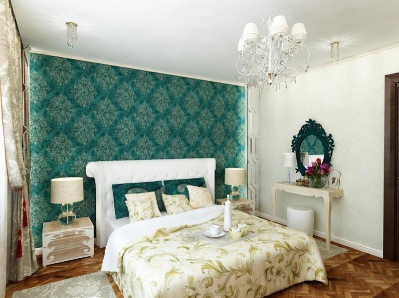 - أخضر مزرق. بالنسبة للخلفيات ذات الظل ، يبدو أن اللون قد تم غسله ، يتغير تحت ظروف الإضاءة المختلفة. إنه اختيار جيد لغرف النوم ذات التصميمات الداخلية ذات المخطط المفتوح وكذلك المساحات العلوية.