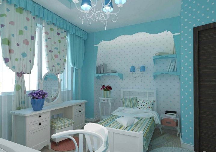يجب تجنب التباينات الحادة والأنماط التجريدية المعقدة - فهي تحيد كل سحر اللون الدقيق. في الحضانة ، يمكنك اختيار ورق جدران باللون الفيروزي بنقاط منقطة أو بنقوش ذات طابع بحري.