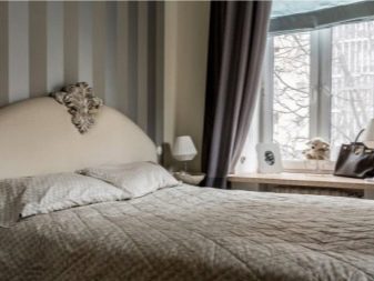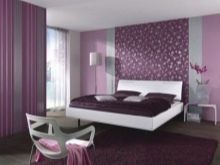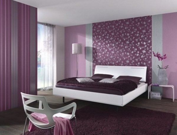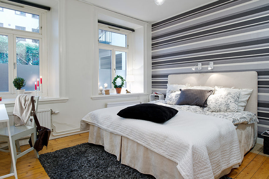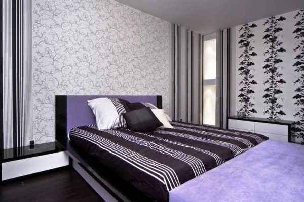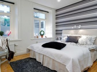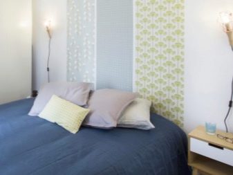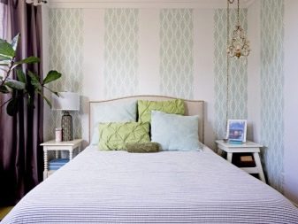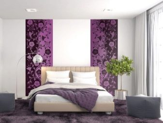 من خلال الجمع بين الخطوط العمودية ، تتميز منطقة السرير ، وهذا ينطبق بشكل خاص على غرف النوم الصغيرة. وبالتالي ، يصبح من الممكن تصور مكان النوم باستخدام شريط عمودي لهجة مختلفة. تُستخدم هذه التقنية عادةً في منطقة اللوح الأمامي ، ويجب أن يتوافق عرض اللكنة مع عرض السرير ، أو تشغل الجدار بالكامل.