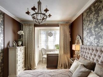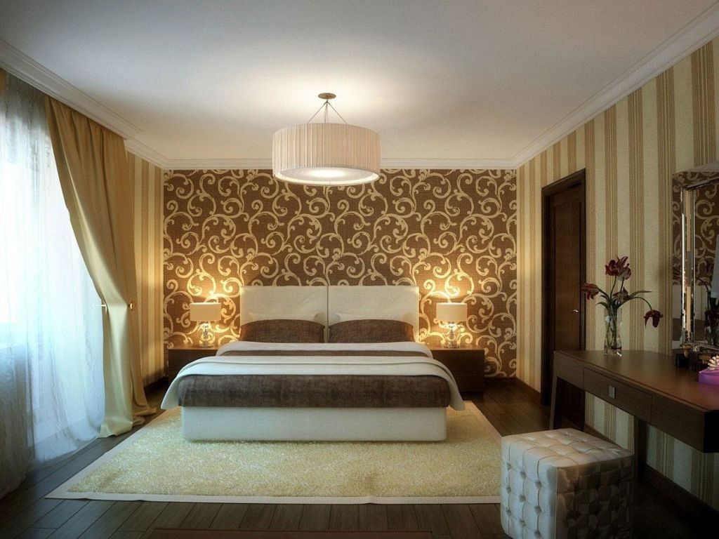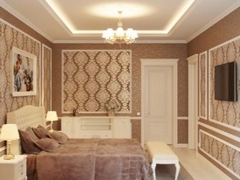 - تصحيح الفضاء. يمكن تعديل الإدراك البصري للغرفة باستخدام ورق الحائط المدمج. ستبدو الغرفة الصغيرة أكبر بكثير إذا قمت بإبراز جدار واحد فقط بلون ساطع أو زخرفة جذابة. ستظهر الغرفة المستطيلة على نطاق أوسع إذا كنت تستخدم لوحة عارية من اللؤلؤ والكراميل وألوان القهوة على الجدران الجانبية والظلال الداكنة على الجدران النهائية. لجعل غرفة النوم الفسيحة بصريًا أكثر راحة ، يجب الانتباه إلى الأنماط الصغيرة أو الأقمشة العادية باللون الأزرق الداكن ، والألوان الدافئة من الشوكولاتة الساخنة ، والطلاءات ذات البقع السوداء. هذا التدرج اللوني يخفي الفضاء بشكل كبير.
