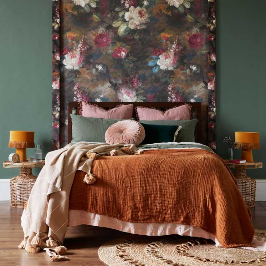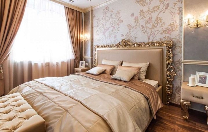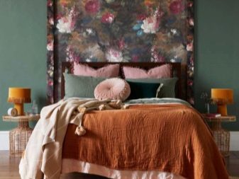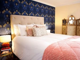 بدلاً من ذلك ، يمكنك أن تأخذ نفس اللون ، ولكن بنقوش منقوشة يكون مكانها فوق السرير.