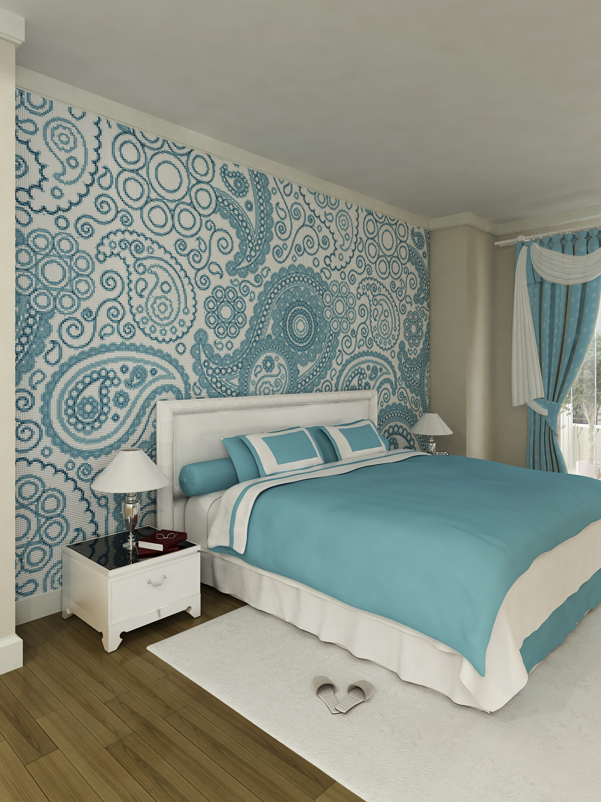 غرفة نوم صغيرة مشرقة مع أثاث أبيض، نمط هندسي كلكنة على الحائط بجانب السرير وورق حائط أبيض مع طباعة دقيقة على الباقي. يتم تخفيف الانسجام المثالي للنغمات الباردة قليلاً بواسطة البقع البيج.