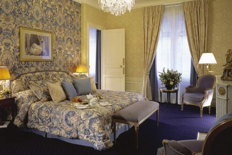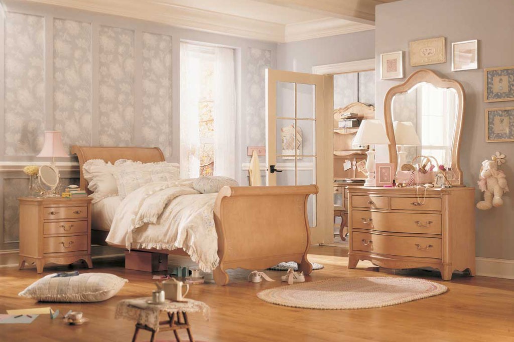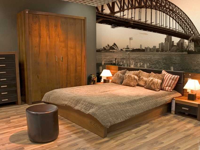غرفة نوم على الطراز العتيق مع ورق حائط للصورلتكبير مساحة صغيرة بصريًا. تضيع النظرة على مسافة منظور تم اختياره بمهارة. تتناغم الأرضيات ذات الألوان الفاتحة تمامًا مع التصميم المختار.