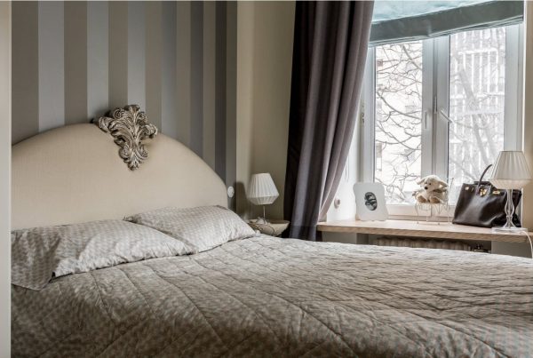 يمكنك لصق خطوط إضافية في أجزاء أخرى من الغرفة ، إذا تم دمجها مع لهجة مجتمعة ووظيفية ، فإن الشيء الرئيسي هو عدم زيادة المساحة. ليس من الصعب عمل لصق ورق الحائط المخطط بترتيب عمودي للخطوط ، لأنه لا يتطلب تعديلًا ، ويزيد النمط بصريًا من ارتفاع السقف.