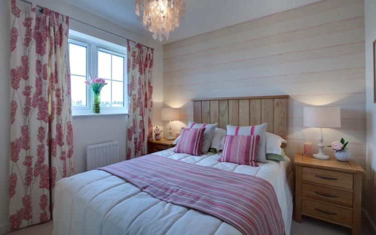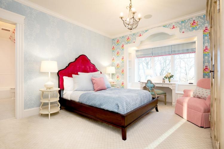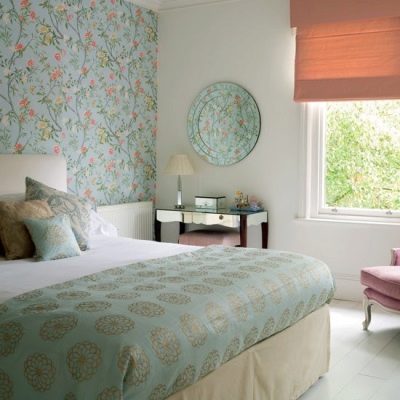 غرفة نوم على طراز بروفانس ، تهيمن عليها مطبوعات الأزهار على الحائط بجانب السرير بألوان هادئة من لوحة بحرية مع إضافة ظلال مرجانية وفيروزية وعارية. يتم تمييز النمط من خلال غطاء سرير يتردد صدى اللون مع جدار بلكنة وستارة من الطين الروماني على النافذة.