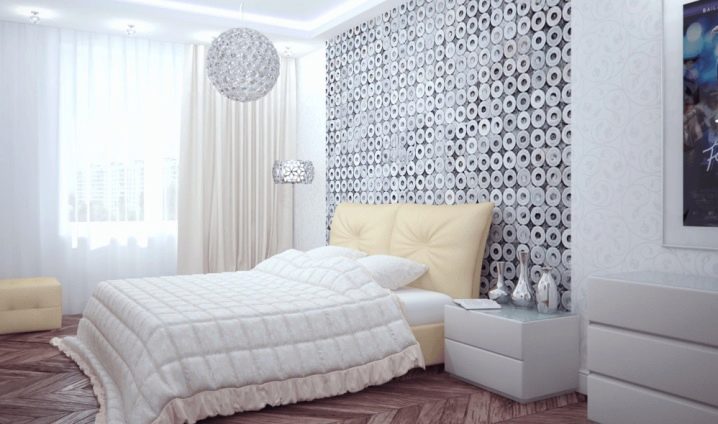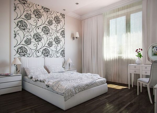 إذا قررت اختيار ألوان هادئة لتزيين غرفة نوم بأثاث أبيض ، فعليك اختيار مادة ذات طباعة زاهية لإبراز أحد الجدران. عند الجمع بين مادة أحادية اللون وورق حائط بلون مختلف ، فأنت بحاجة إلى تحديد نفس اللوحات أحادية اللون في ظلال أخرى.