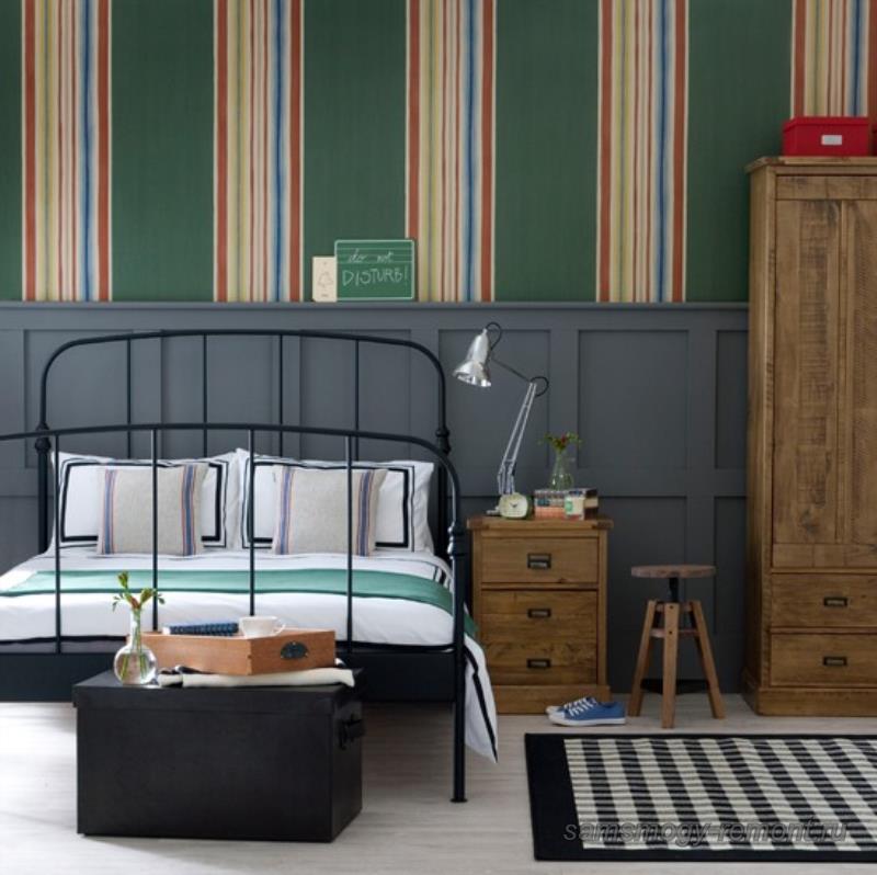 ستساعد هذه التقنية في تحقيق تأثير بصري ممتاز. يتم تحقيق نتائج ممتازة بالتناوب بين الخطوط الملونة. هذا الحل ممكن فقط عند استخدام ورق الحائط بنفس الملمس. يمكن أن يكون تناوب الخطوط إما تخطيطيًا - من خلال 1 ، 2 ، 3 صفوف ، أو فوضوي ، غير منظم. يمكن تطبيق هذه الطريقة باستخدام ألوان مختلفة ، مزيج من عدة ظلال من نفس اللون ، مزيج متباين من ألوان مختلفة.