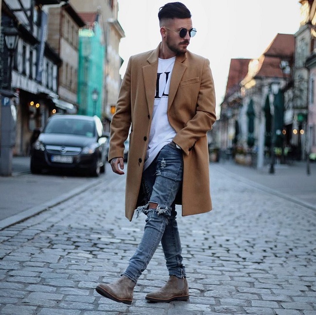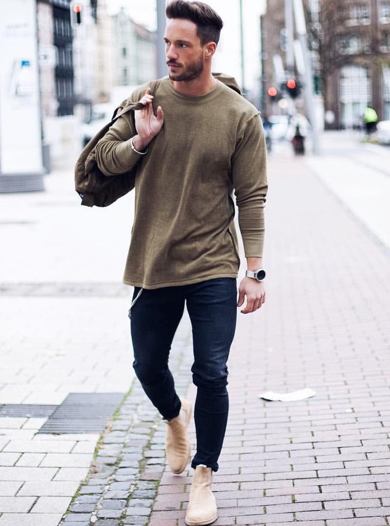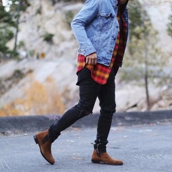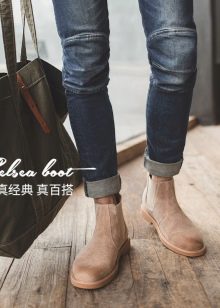 لمظهر أقل رسمية ، سوف يعمل هذا الحذاء أيضًا. سيتم دمج تشيلسي بشكل جميل مع القمصان أو القمصان ذات الياقة المدورة العادية ، والقمصان المنقوشة ، بالإضافة إلى البلوزات أو السترات الملونة المحبوكة. يمكنك استكمال مظهرك مع الجينز ، مع عدم إهمال الركب الممزقة. في الخريف ، يمكنك إضافة سترة جلدية إلى المظهر.
