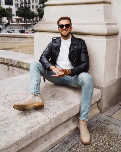 - يمكن لعشاق النمط غير الرسمي أيضًا شراء أحذية تشيلسي لخزانة ملابسهم. ليس من الصعب صنع قوس جميل معهم. على سبيل المثال ، بنطال الجينز الضيق باللون الرمادي الفاتح ، وقميص خفيف وسترة من الجلد الأسود لراكبي الدراجات النارية. من الأحذية إلى هذا المظهر ، يمكنك اختيار أحذية رياضية ، لكن تشيلسي هو الذي سيجعل القوس أكثر صرامة وضبطًا.كل هذا يمكن استكماله بإكسسوارات: حقيبة جلدية صغيرة للرجال أو حقيبة ظهر ، نظارات ، بالإضافة إلى ساعة يد.