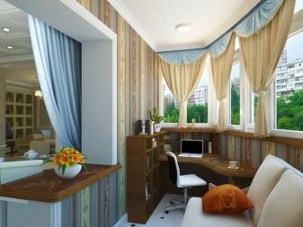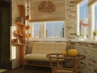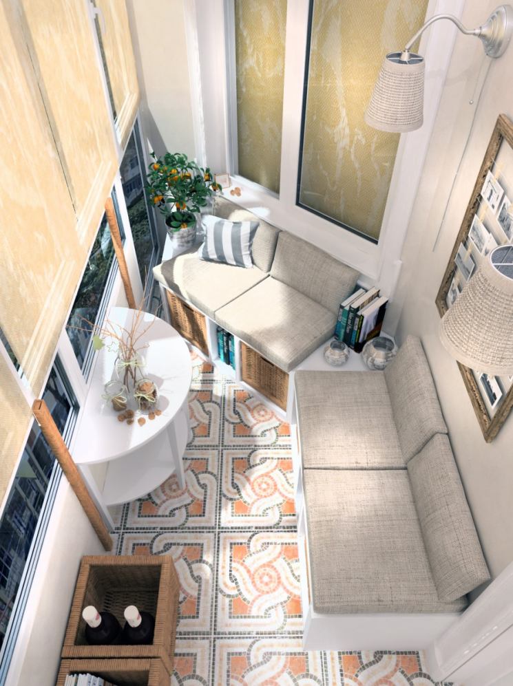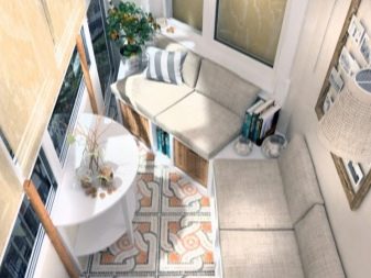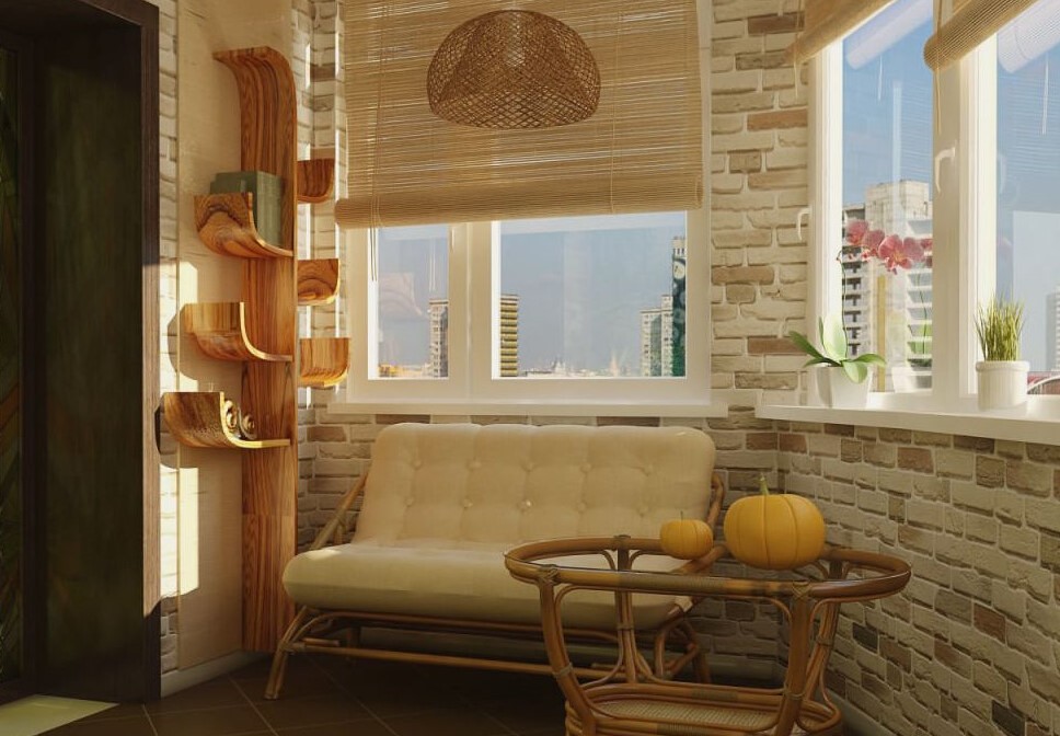 الحل الأكثر شيوعًا هو ترتيب منطقة ترفيهية على لوجيا. ستعمل الكراسي ذات المساند المصنوعة من الخيزران وطاولة القهوة المريحة والسجادة المريحة مع غرفة فسيحة ومشرقة على تحسين مزاجك تلقائيًا. وإذا كانت المنطقة تسمح لك بوضع أريكة أو أريكة على الشرفة ، فستحصل على سرير إضافي في حالة وصول الضيوف.