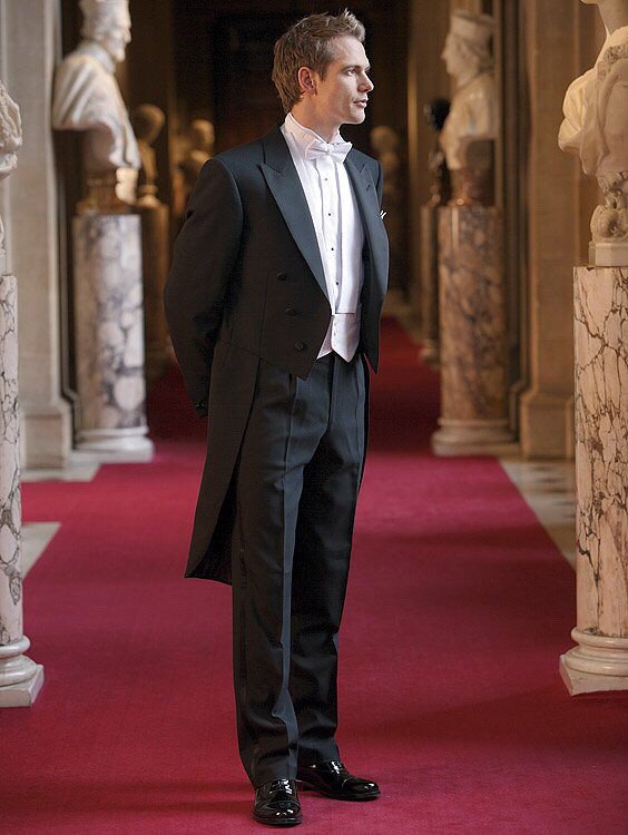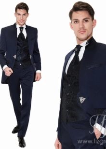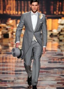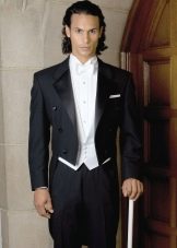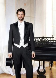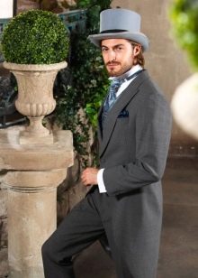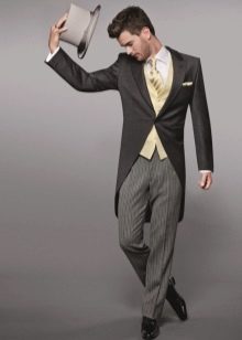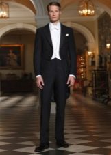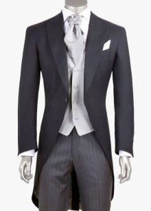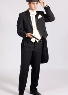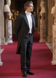 يمكن أن يكون لون ربطة العنق أبيض أو فاتح ، لؤلؤي ، رمادي. إذا تم اختيار قميص ذو ياقة متدلية للزي ، فلن يتم ارتداء ربطة العنق. يمكنك أيضًا اختيار هذا الملحق ليلائم السترة. غالبًا ما يتم ارتداء العلاقات السوداء أثناء الحداد. أحذية - أحذية جلدية براءات الاختراع.