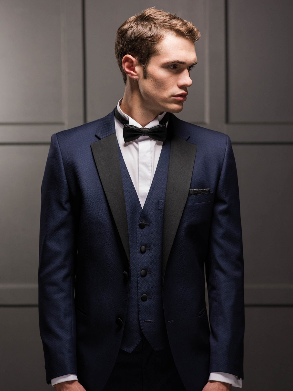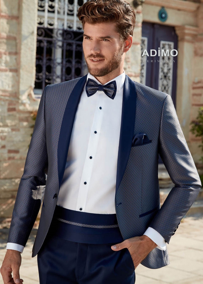 - طية صدر السترة مزينة بمادة حريرية لامعة.