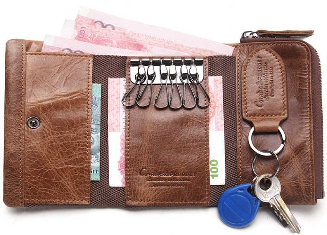 يفضل العديد من الرجال شراء محافظ مريحة ، تكملها تفاصيل مفيدة مثل مدبرة المنزل. في الأساس ، هذا المنتج كبير. تم تجهيز حجرة إضافية فيه بلوحة خاصة مع carabiners. هذا الأخير ضروري حتى تتمكن من ربط المفاتيح بشكل آمن.