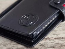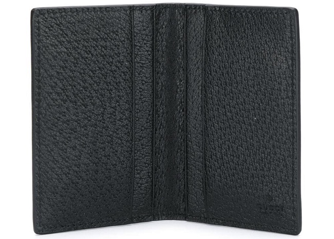 يحتوي المنتج على مقصورات للأوراق النقدية ، و 16 فتحة لبطاقات الائتمان. يوجد إبزيم مزخرف باللون الذهبي مكون من الأحرف الأولى من Guccio Gucci.