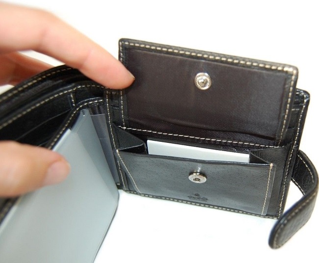 يحتوي هذا الملحق ذي العلامة التجارية على 4 فتحات لبطاقات الائتمان ، ومقصورة للأوراق النقدية والشيكات. يوجد أيضًا جيب صغير للعملات المعدنية. يتم إغلاق الأخير عن طريق صمام صغير به زر مخفي.