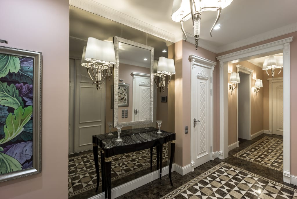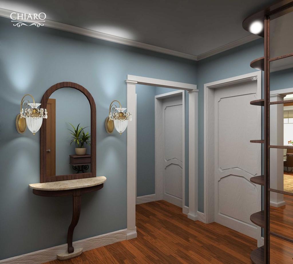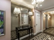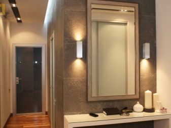 الحل الكلاسيكي هو تثبيت الشمعدانات على جانبي المرآة في الممر. من المهم التأكد من أن وحدات الإنارة بعيدة عن التركيبات الأخرى.