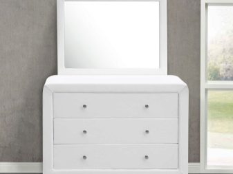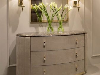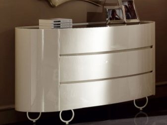 يعد هذا الخيار حلاً غير عادي إلى حد ما ، حيث يتم إنتاجه باستخدام تقنية خاصة تسمح لك بإنشاء أجزاء مستديرة. سوف تتناسب خزانة الأدراج هذه تمامًا مع التصميم الكلاسيكي ، في حين أنه من الممكن العمل بعدة ألوان. يخلق هذا الأثاث إحساسًا بالخطوط الناعمة ، وهو فسيح جدًا عند مقارنته بالركن الأول. سيكون الاختيار الأمثل هو خزانة ذات أدراج نصف قطرها مع مرآة.