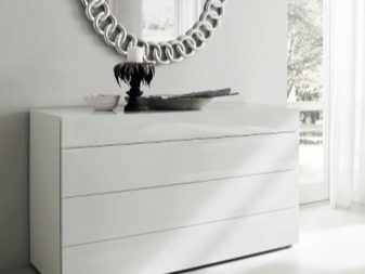 نظرًا لعدم وجود نوافذ في الممر عادةً ، يجب إعطاء الأفضلية للأثاث ذي الألوان الفاتحة. تبدو الخزائن ذات الأدراج بألوان الباستيل رائعة. الحل الكلاسيكي هو خزانة ذات أدراج بيضاء مع مرآة. سيضيف هذا العنصر جماليات ، بالإضافة إلى زيادة مساحة الغرفة بصريًا ، لذلك غالبًا ما يتم اختياره للممرات الصغيرة. ستبدو العناصر المحيطة بخزانة الأدراج البيضاء أكثر تعبيرًا.