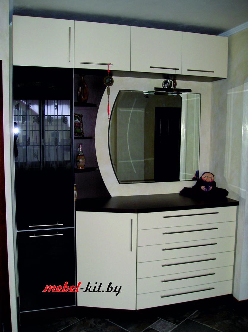 البديل المدمج هو أحد أحدث الابتكارات. عادةً ما يتم اختيار خزانة ذات أدراج مع مرآة في الممر لتتناسب مع لون الأثاث الآخر ، على الرغم من أنه يمكنك أيضًا اختيار خيار متباين فيما يتعلق بمنحدرات الأبواب. عادة ما يتم تقديم النموذج المدمج بدون عناصر زخرفية ، وهو مصنوع من ألواح الخشب الرقائقي.
