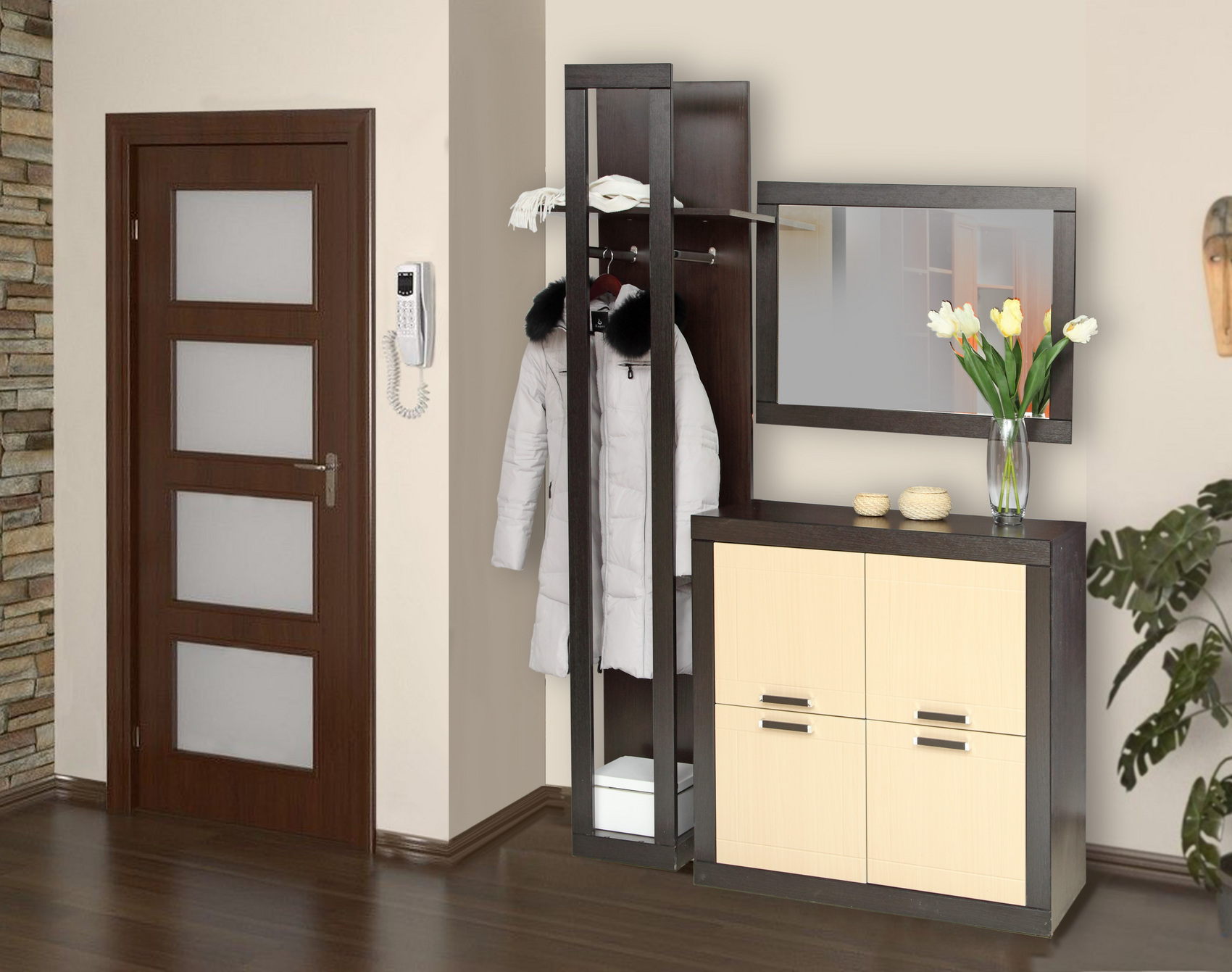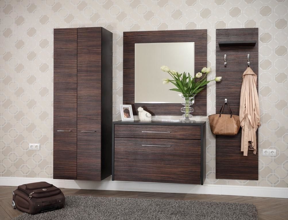 يمكن صنع خزانة ملابس للممر من مواد مختلفة. كثيرا ما يستخدم اللوح الرقائقي. يتم تمثيل الجزء الخارجي من الأثاث بالواجهة. هو المسؤول عن المظهر وكذلك عن شروط الاستخدام. يمكن أن تكون واجهات خزانة ذات أدراج مع مرآة في الردهة مصنوعة من مواد مختلفة.