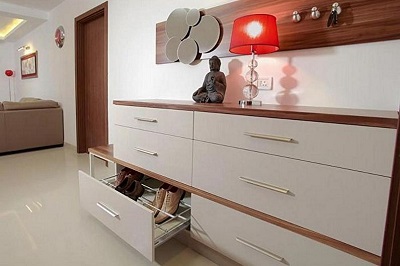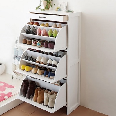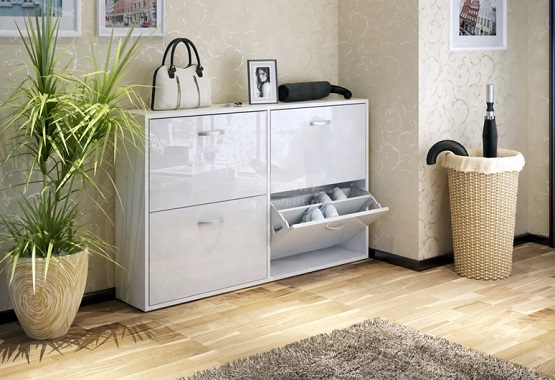 - يمكن أن تكون خزانة الأحذية البيضاء أيضًا زخرفة داخلية جيدة. يمتزج بشكل جيد مع عثماني أبيض دائري وأرضية معبرة داكنة.