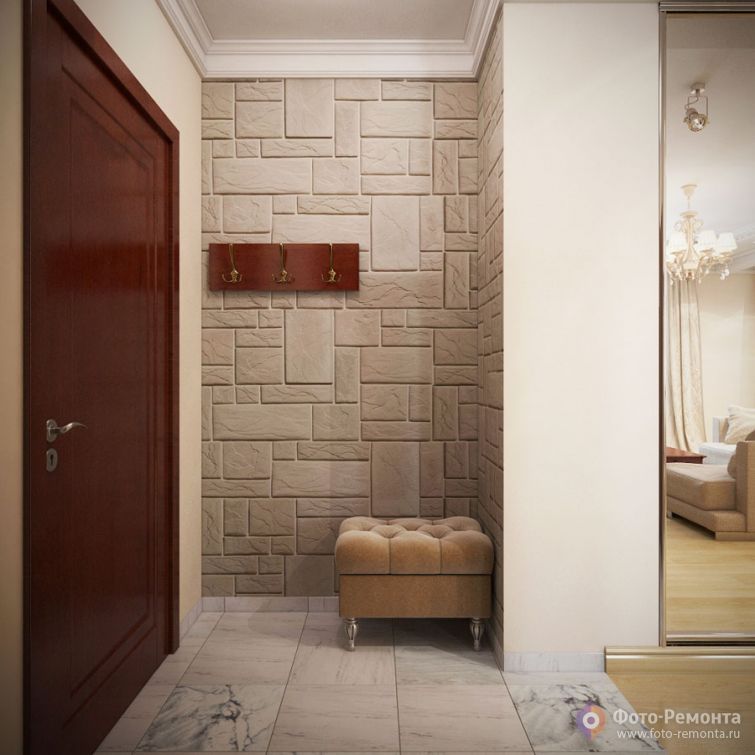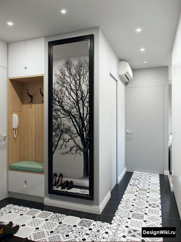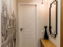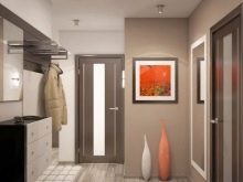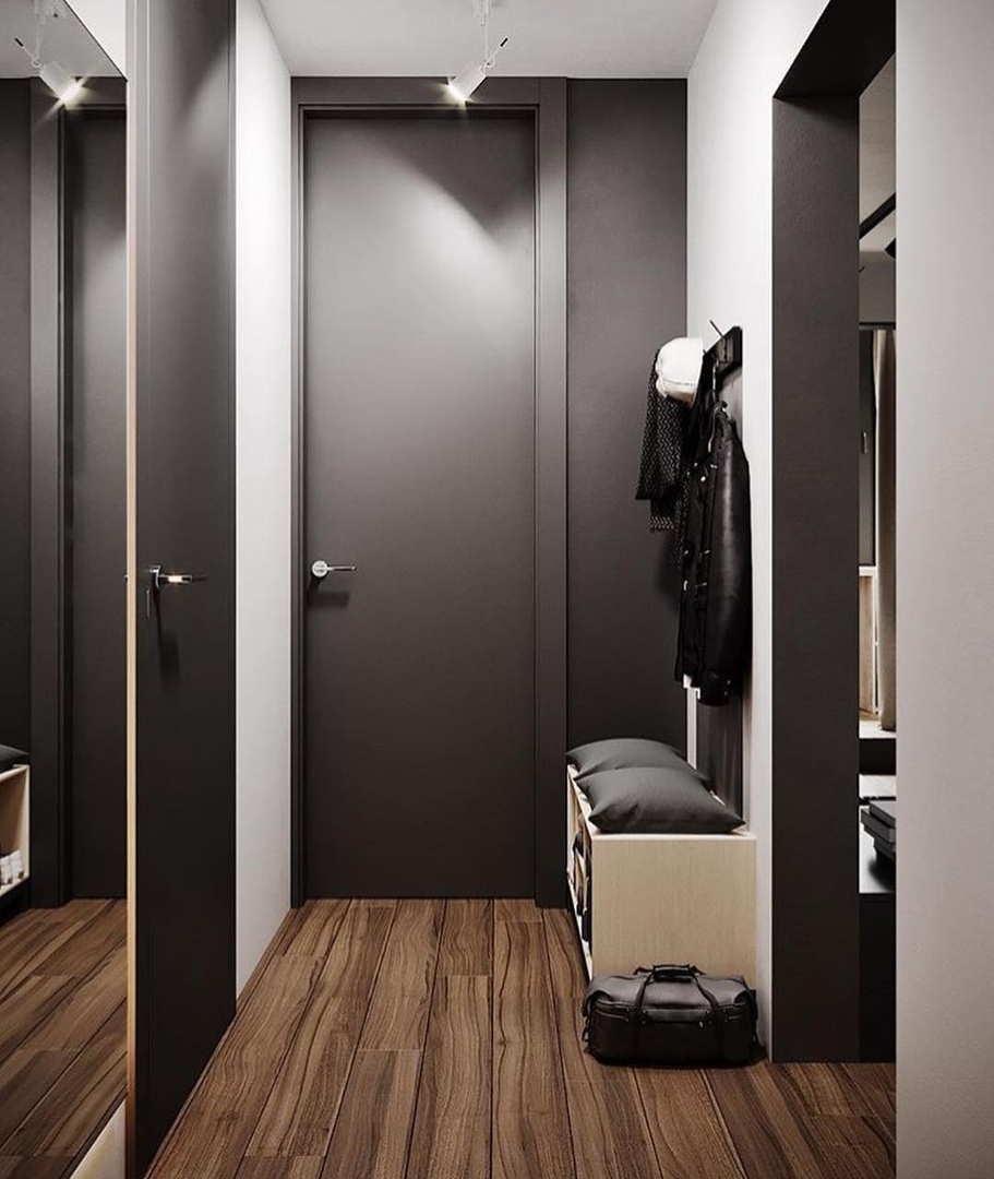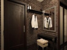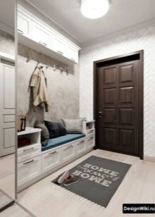 لا يسمح الرواق الصغير للخيال بالتجول ، لكنه يسمح لك بتزيين المساحة بأسلوب واحد واختيار النهاية الرابحة ، كما في هذه الحالة. الشماعات الصغيرة والمقعد في وضع جيد مقابل الحائط. تبدو زخرفة الجدران الخفيفة جيدة على خلفية الأبواب المظلمة.