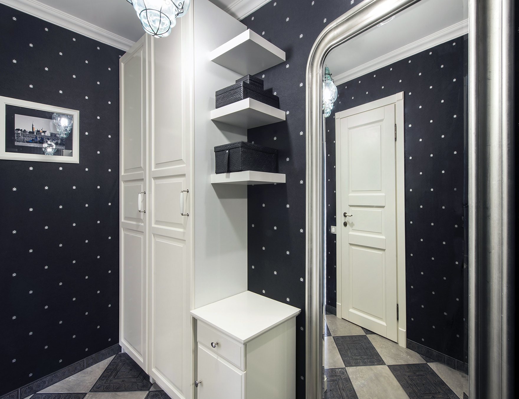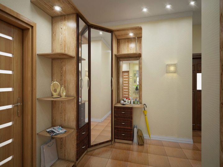 في هذه الحالة ، تتناسب خزانة الزاوية ، المكملة بحامل ، حيث يمكنك وضع كل من الأشياء الضرورية والعناصر الزخرفية ، بشكل جيد في الردهة الفسيحة. كان هناك مكان للرفوف والخزائن. تكمل إضاءة السقف والإضاءة على الرفوف الصورة العامة.