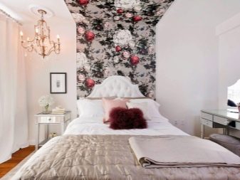 عادة ، في غرف النوم الصغيرة ، لإضفاء لمسة في الغرفة ، تم تزيين جدار واحد فقط بورق حائط زهري - خلف السرير أو بجانبه. ولكن بالنسبة لجميع الجدران الأخرى ، يتم اختيار ورق الحائط العادي. إذا تم تثبيت السرير في قوس ، فيمكن وضع لوحة زهور جميلة فيه.
