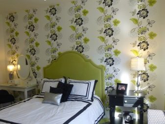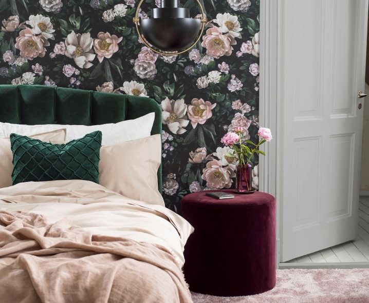 - عند تركيب الاثاث الغامق في الغرفة مثل الاخضر او الاسود ، يفضل الخبراء خلفيات الأزهار مع أزهار متوسطة الحجم تقع على خلفية داكنة. في الوقت نفسه ، يتناغم نظام الألوان الخاص بهم تمامًا ليس فقط مع الأثاث في الغرفة ، ولكن أيضًا مع جميع ملحقات المنسوجات ، وكذلك مع تنجيد السرير نفسه.