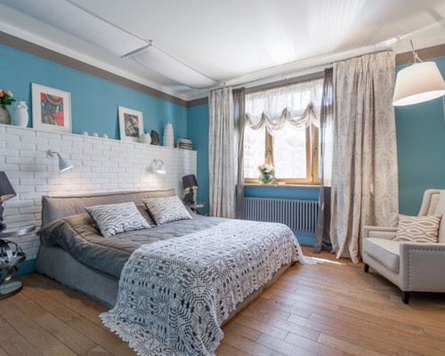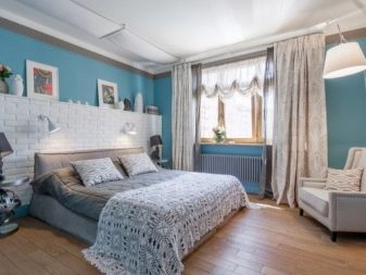 غرفة النوم ذات اللون الأزرق تكملها الستائر ذات اللون البيج الرمادي. علاوة على ذلك ، عند اختيار الديكور ، من الأفضل التركيز على ظلال اللون الأزرق والبيج. والنتيجة هي مخطط ألوان دقيق للغاية وهادئ من شأنه أن يهدئ من الهدوء والاسترخاء.