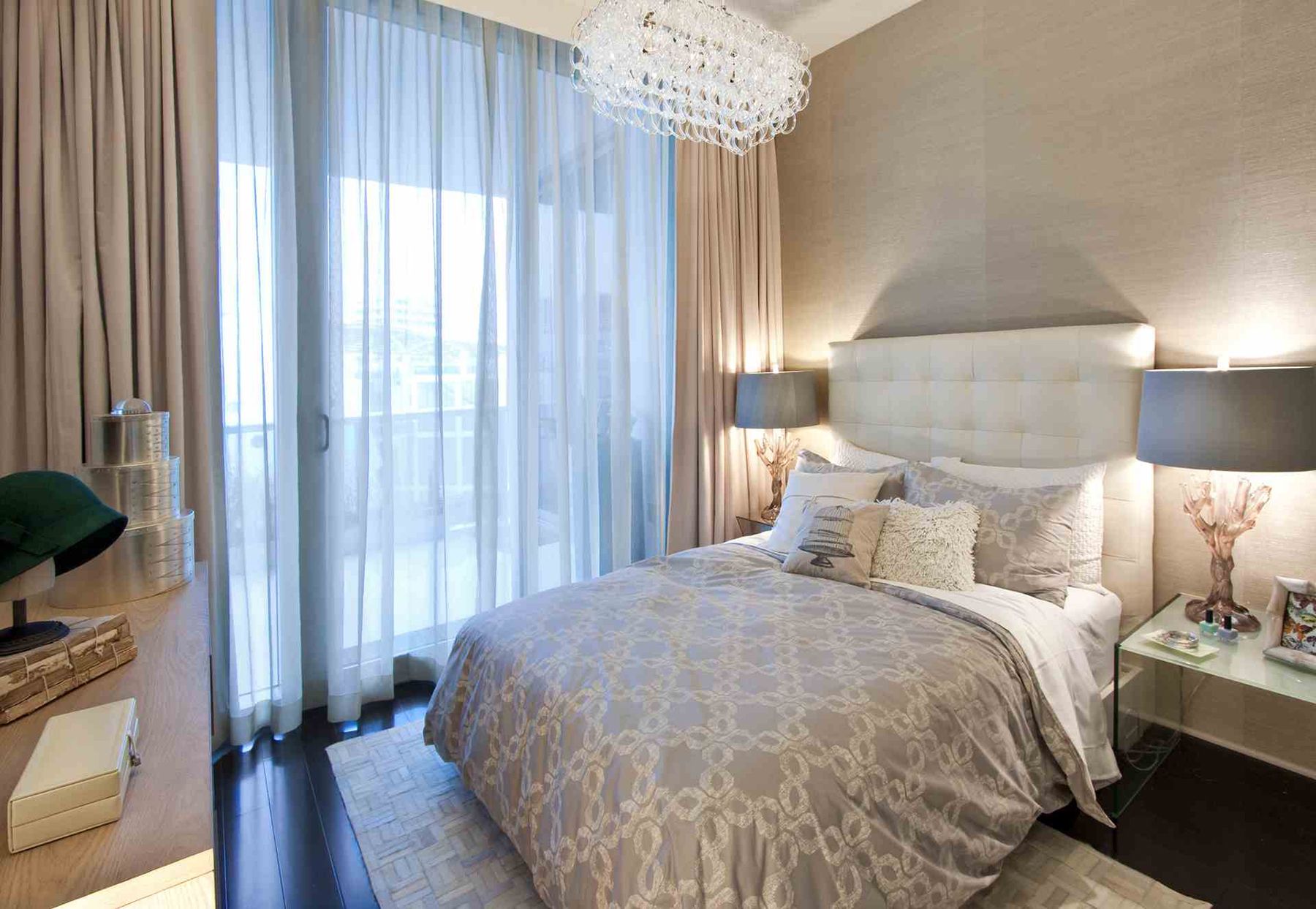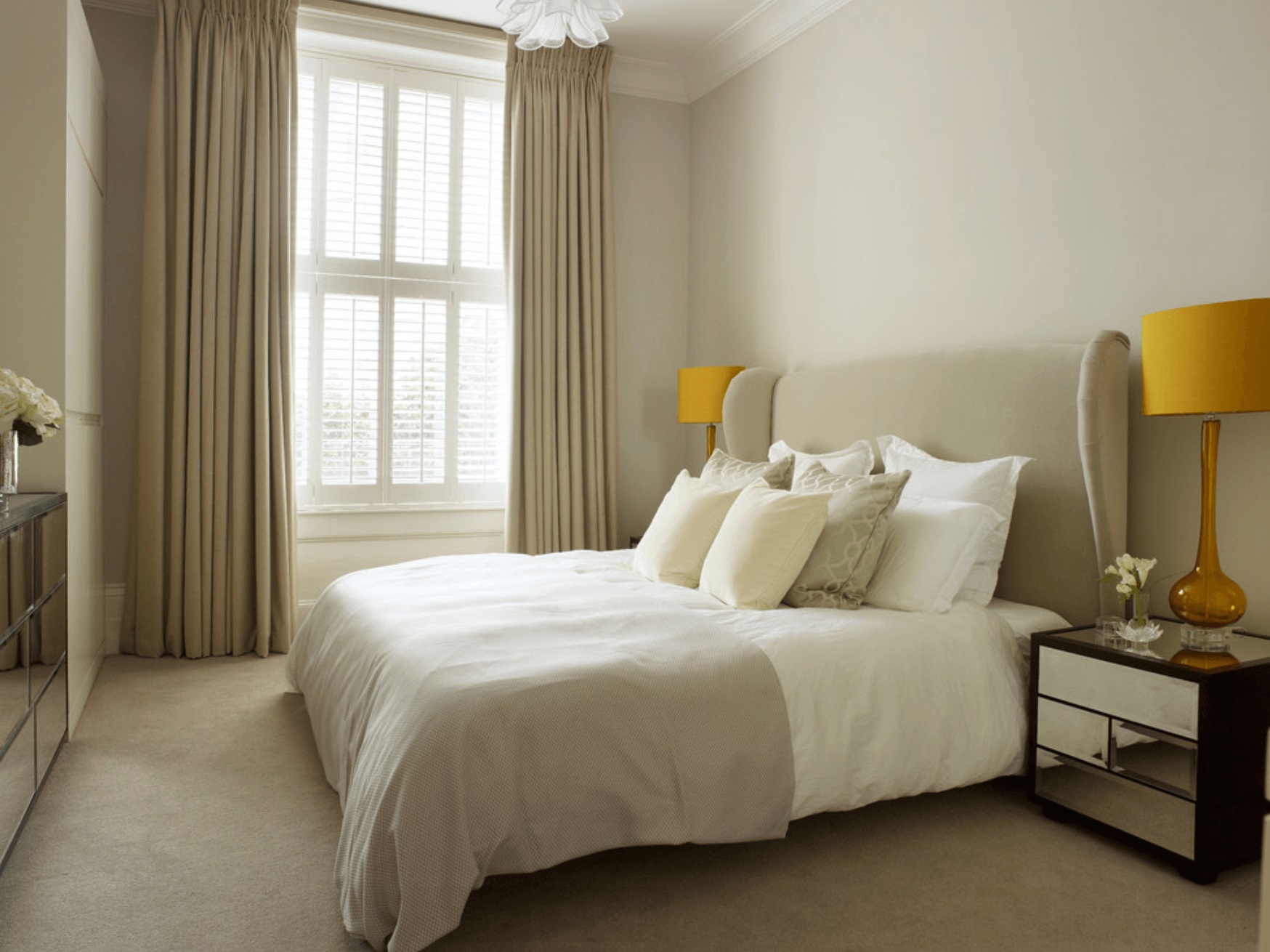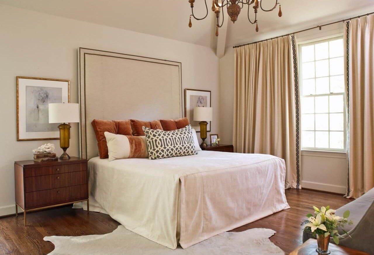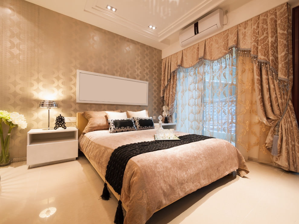 - يمكن أن تضيف الستائر البيج لمسة من الفخامة إلى الديكور العام لغرفة النوم ، وهذا هو الحال بالضبط. ومع ذلك ، تتوافق العناصر الأخرى أيضًا مع النمط العام.