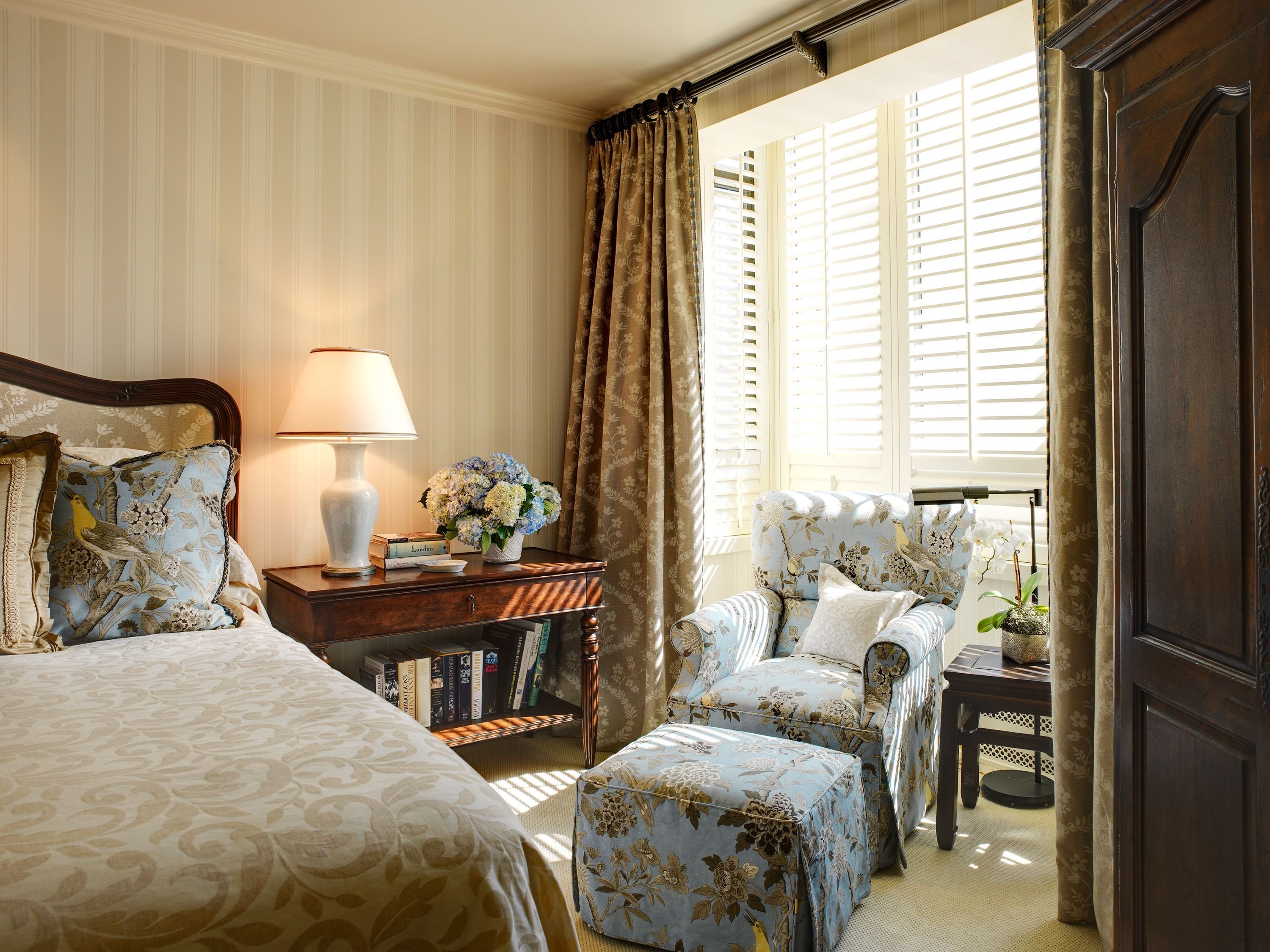 - في غرفة النوم مع ستائر بيج وجدران داكنة المصابيح الصفراء بمثابة لهجات مشرقة.