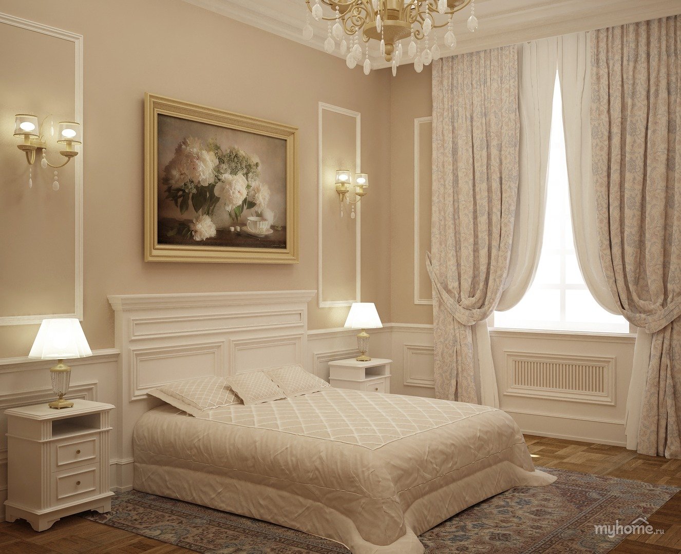 - تتماشى الستائر البيجية والذهبية ، المكملة بالتول الأبيض ، بشكل جيد مع الديكور العام لغرفة النوم. غطاء سرير مع وسائد وإطارات على مرايا وجدران تبدو متناغمة مع الجيران.