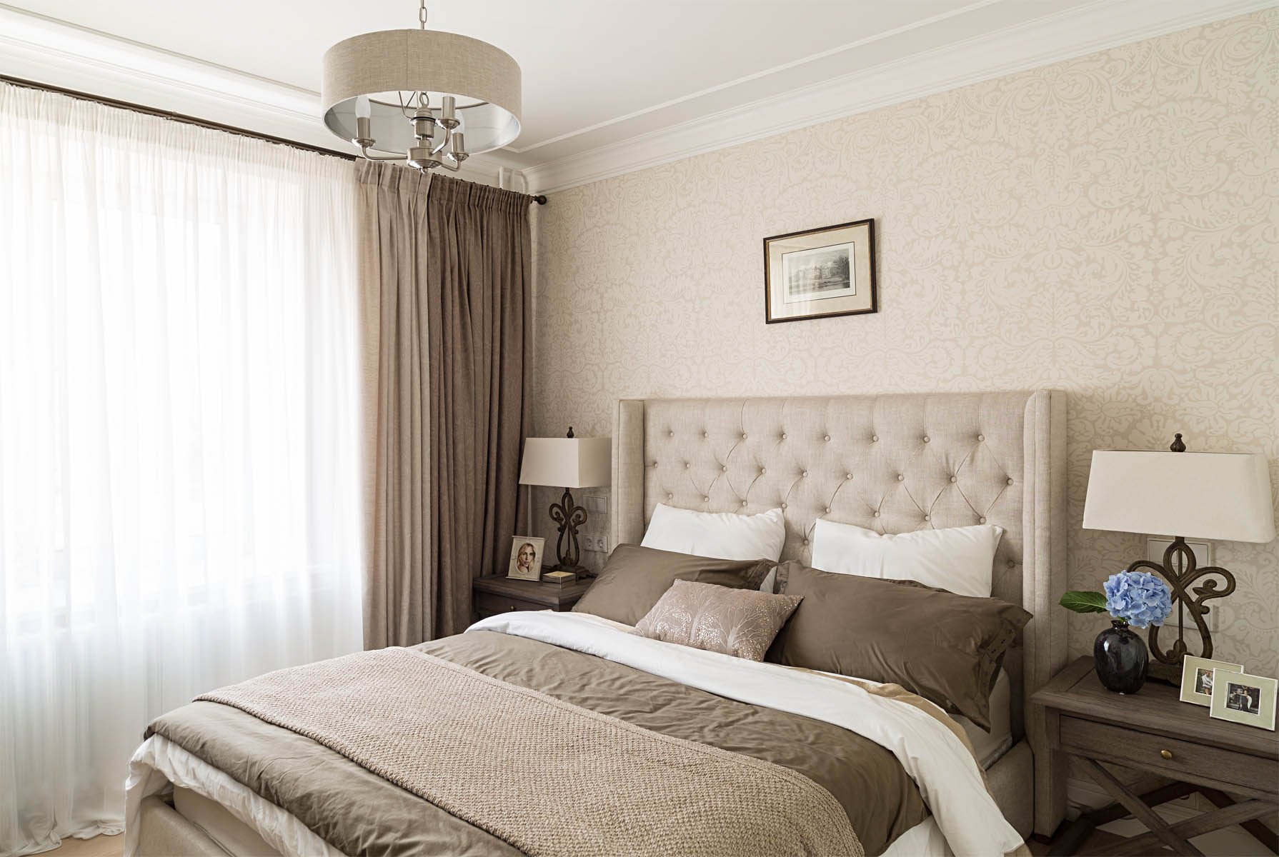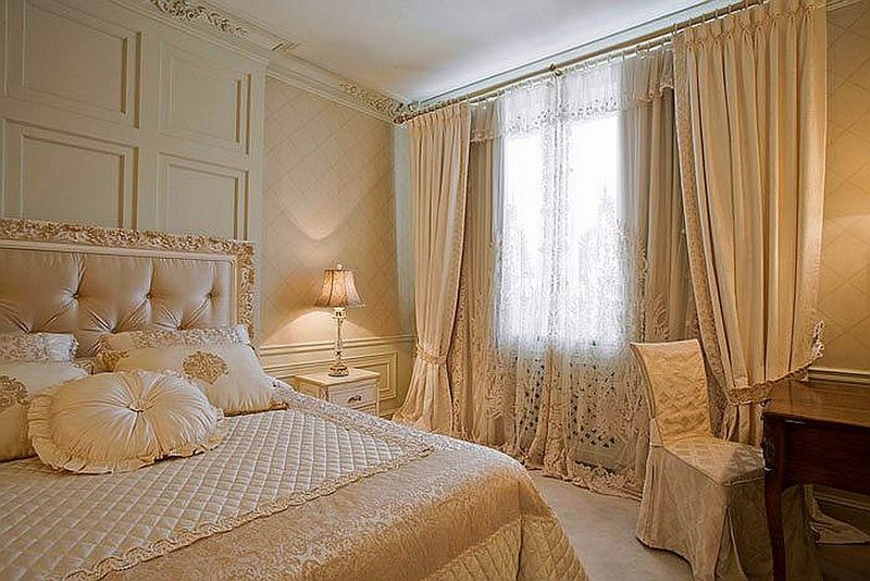 - ستائر بيج مع تول أزرق ناعم - مزيج لطيف وجميل. جميع العناصر الأخرى في غرفة النوم مصممة باللونين الأبيض والبيج ، مما يجعل الجو العام دافئًا ومريحًا.