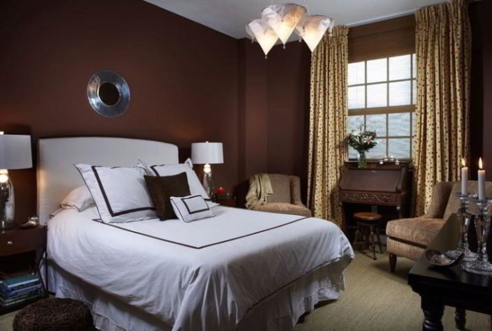 ستبدو الستائر البنية رائعة على الجدران البيضاء. وحتى لو كانت المنسوجات خفيفة أيضًا ، يمكن أن يتكرر لون الستائر ، على سبيل المثال ، رأس السرير أو كرسي بذراعين.