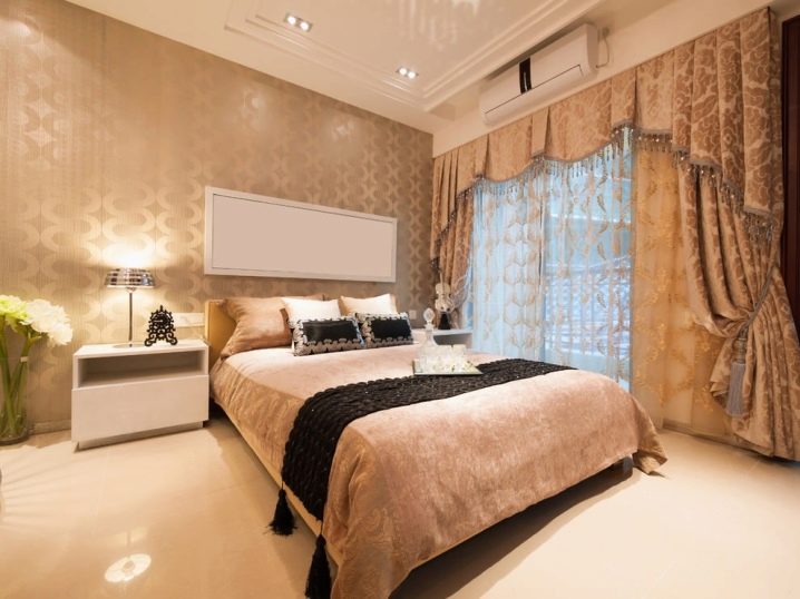 إذا كنت تنوي تزيين النوافذ بستائر بيج ، فعليك التفكير مسبقًا في زخرفة غرفة النوم والمفروشات والمنسوجات والعناصر الزخرفية الأخرى. يمكن دمج الجدران البنية بشكل مثالي مع الستائر البيج والأرجواني ونفس البطانية على السرير. في الوقت نفسه ، يجب أن يكون السقف أبيض اللون ، مع استكماله بثريا أو مصابيح جميلة. يمكن أن تكون الأرضية إما فاتحة أو مظلمة. بالإضافة إلى ذلك ، يمكنك وضع سجادة ناعمة لتتناسب مع الستائر على الأرض.