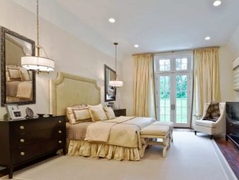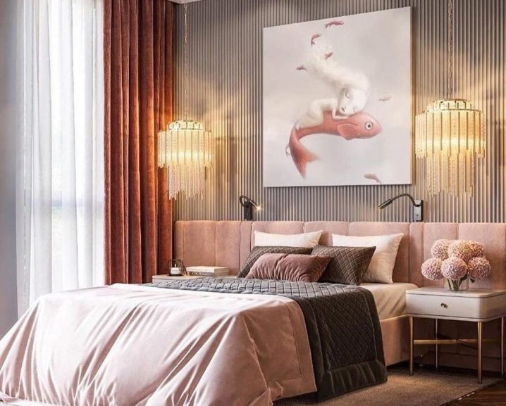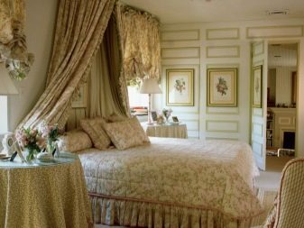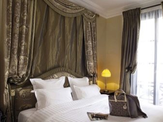 في هذه الحالة ، لا ينبغي الجمع بين الألوان فحسب ، بل يجب أيضًا دمج المنسوجات مع الديكور. على سبيل المثال ، يبدو التول مثاليًا مع الحديد المطاوع أو عناصر السرير الخشبية ، لكنه لا يتطابق مع الألواح الأمامية المصنوعة من القطيفة أو الجلدية على الإطلاق.
